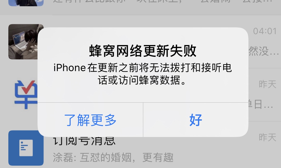 首先,感谢 JonathanBO 和芝华塔尼奥提供的建议。我了解到您在 iPhone 上看到“蜂窝网络更新失败”的提醒,建议您不妨参考以下文档: