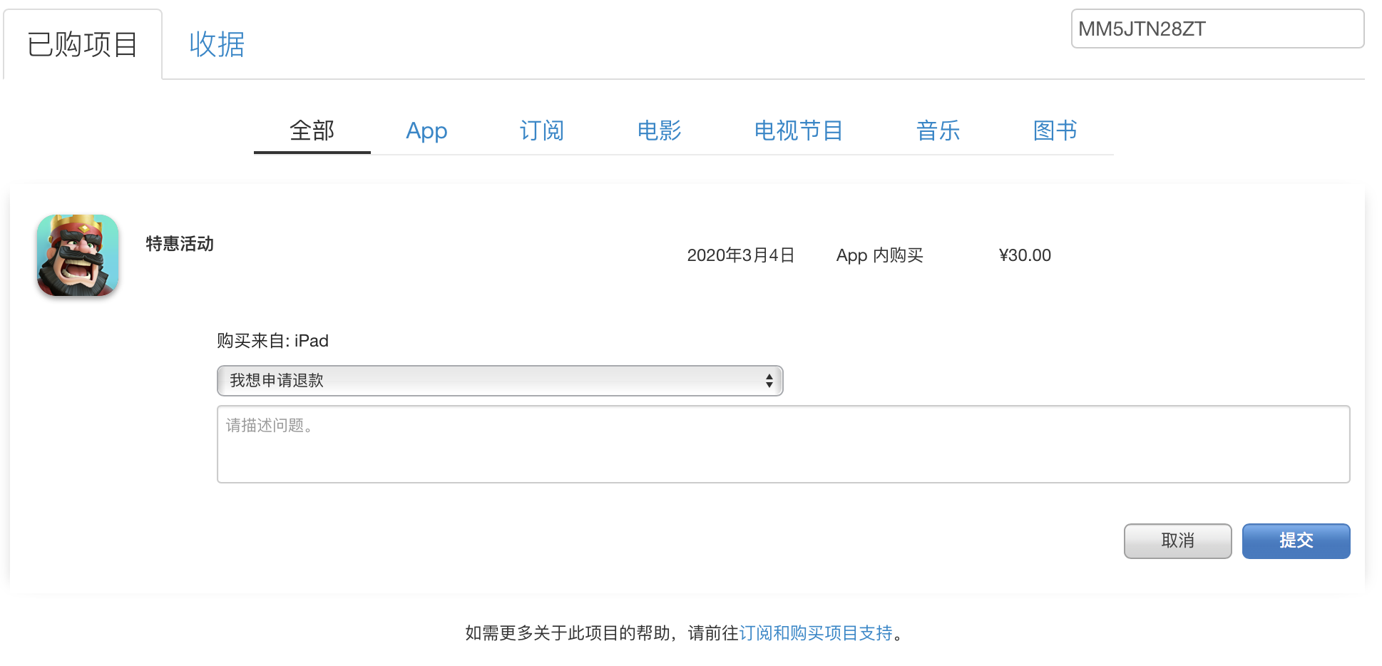 您在游戏中的内购消费,APPLE会通过邮件的方式提供收据,在邮件中点击【报告问题】后会弹出网页,下拉菜单中选择【我想申请退款】按提示要求操作即可。