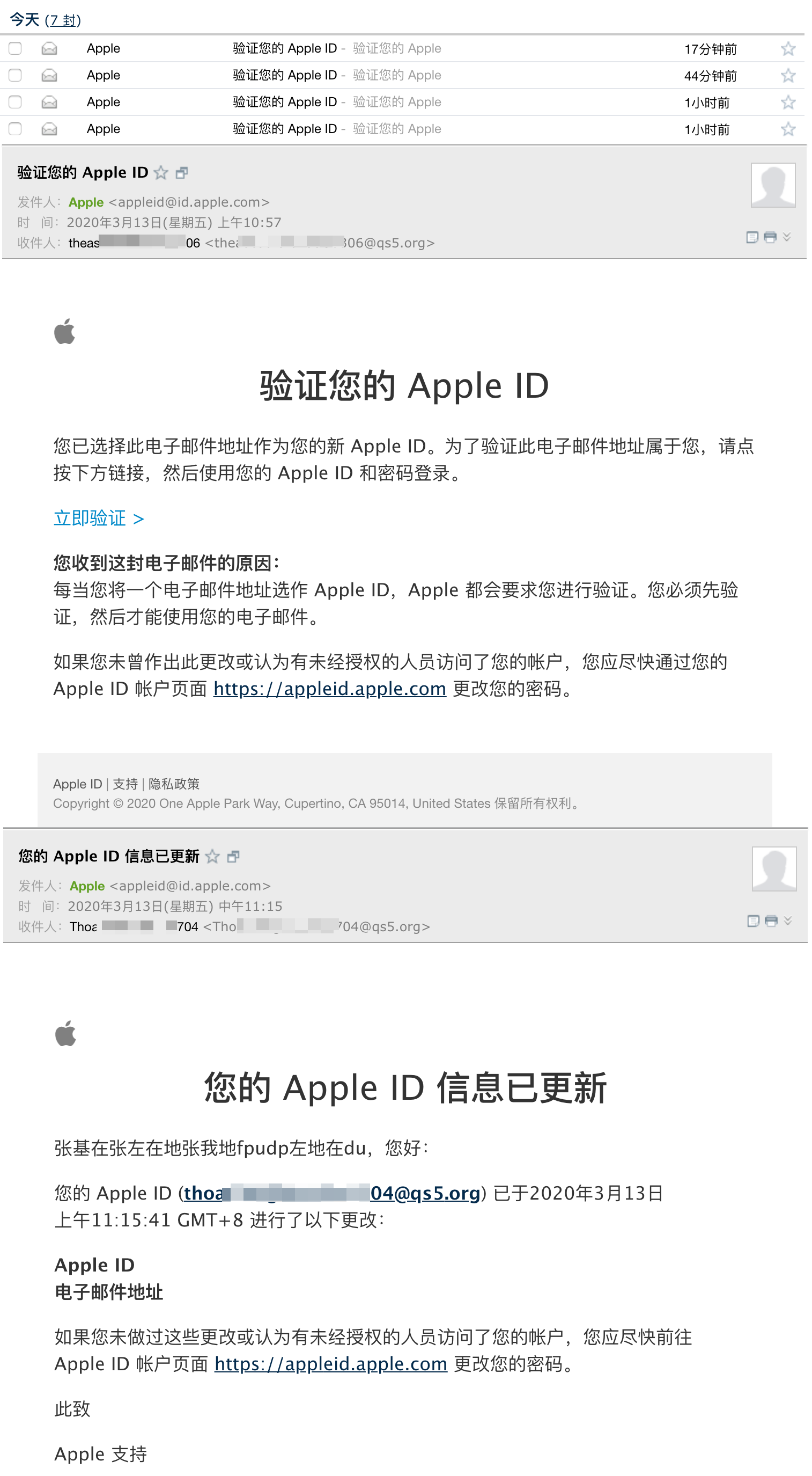 验证邮件的邮箱我没有点开,却在登录 "https://appleid.apple.com/" 后(同时)收到了“您的 Apple ID 信息已更新"的邮件”(可能是巧合?)