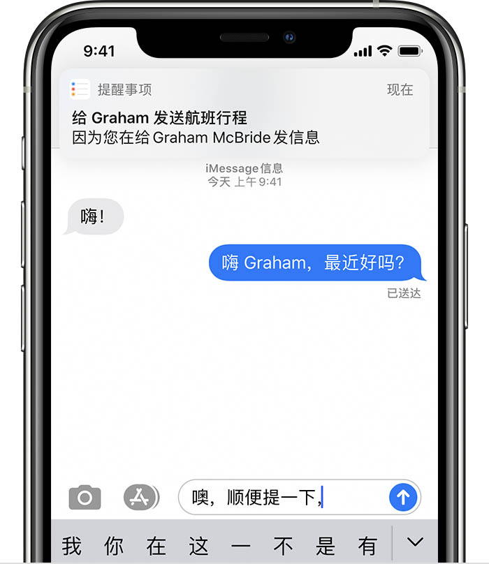 在发消息时打开“提醒我”,轻点“选取联系人”,然后轻点某个联系人的姓名。