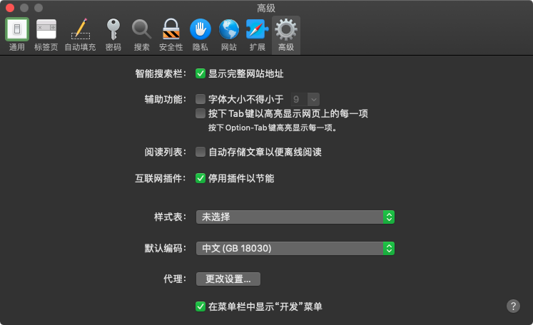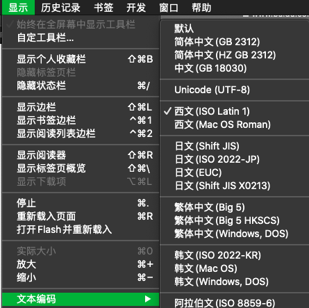在Safari的显示菜单中的文本编码中,选择“默认”。如果选择诸如西文(如下图)等,就有可能无法显示中文。