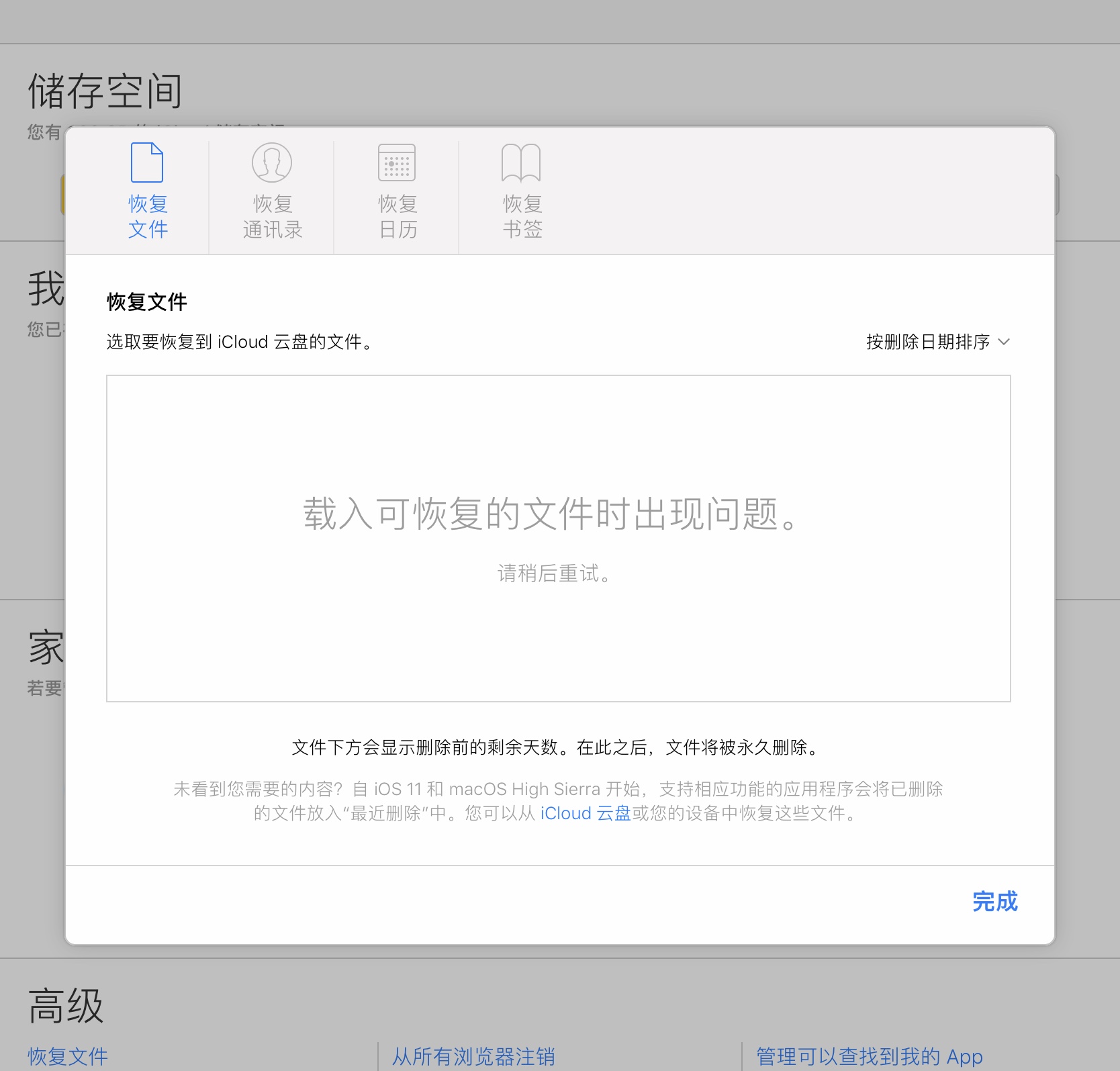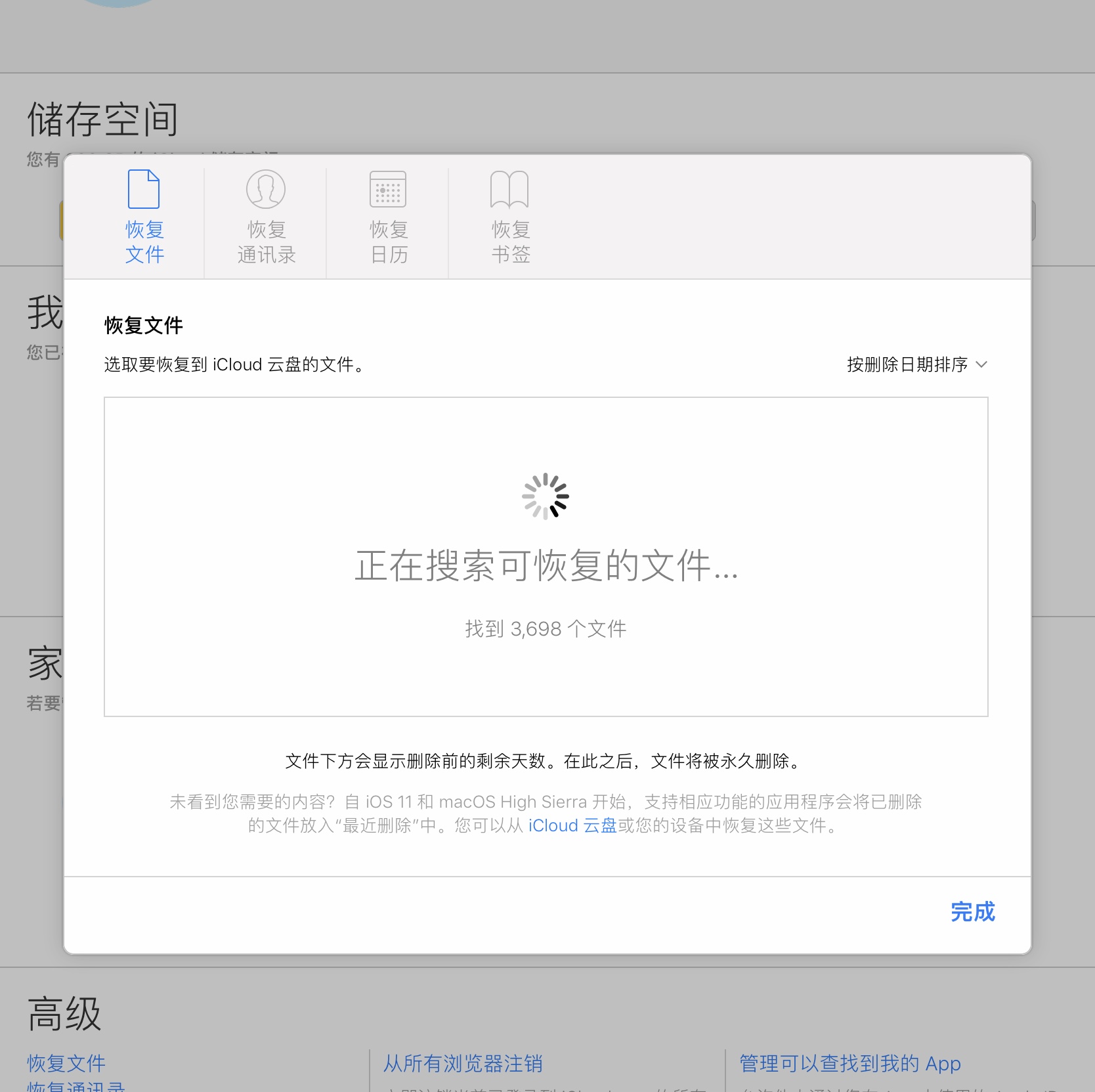 在iCloud网页端恢复文件,每次搜索到3698个文件时,恢复就中断了。重复过很多次,换过不同设备和网络,都是搜索到3698个文件就中断。