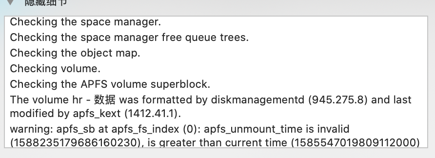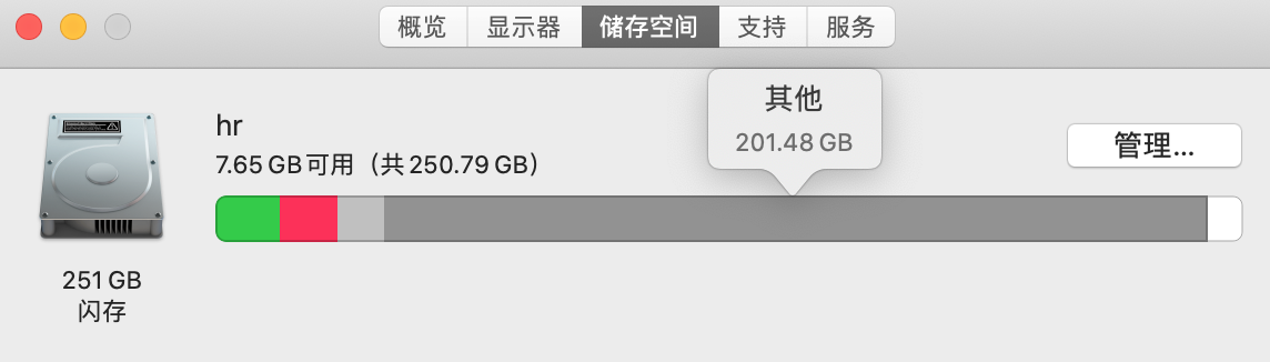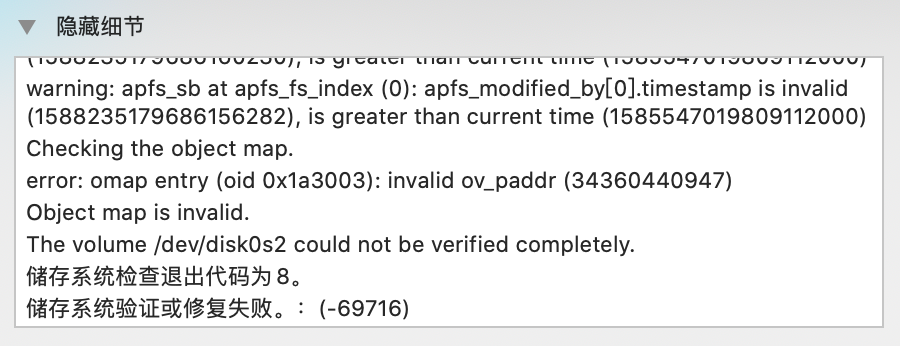 在年后突然发现硬盘空间不足,删除文件发现磁盘容量没有减小,经检查发现删除的文件容量跑到“其他”部分里了,而且用Diasydisk和CleanMyMac X这些第三方无法查看到这部分隐藏空间,(话说苹果自带的系统信息也看不到),用磁盘工具急救也是失败的,报错 -69716。