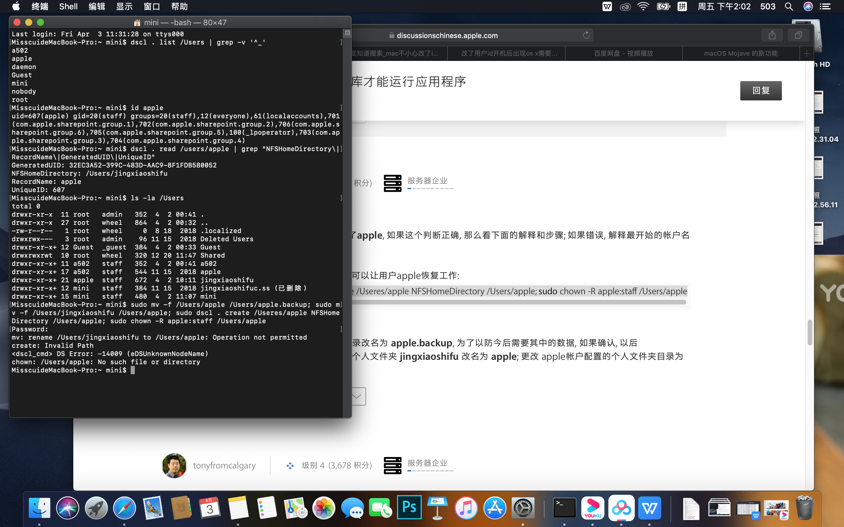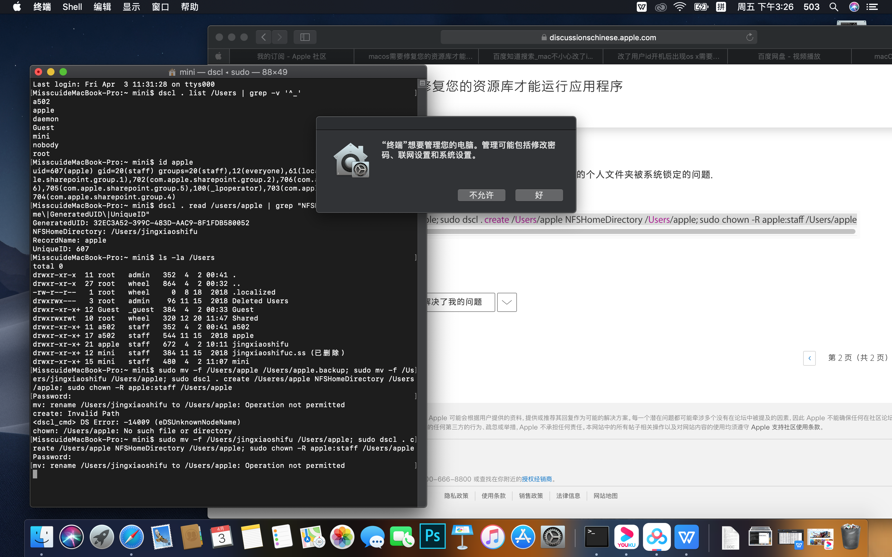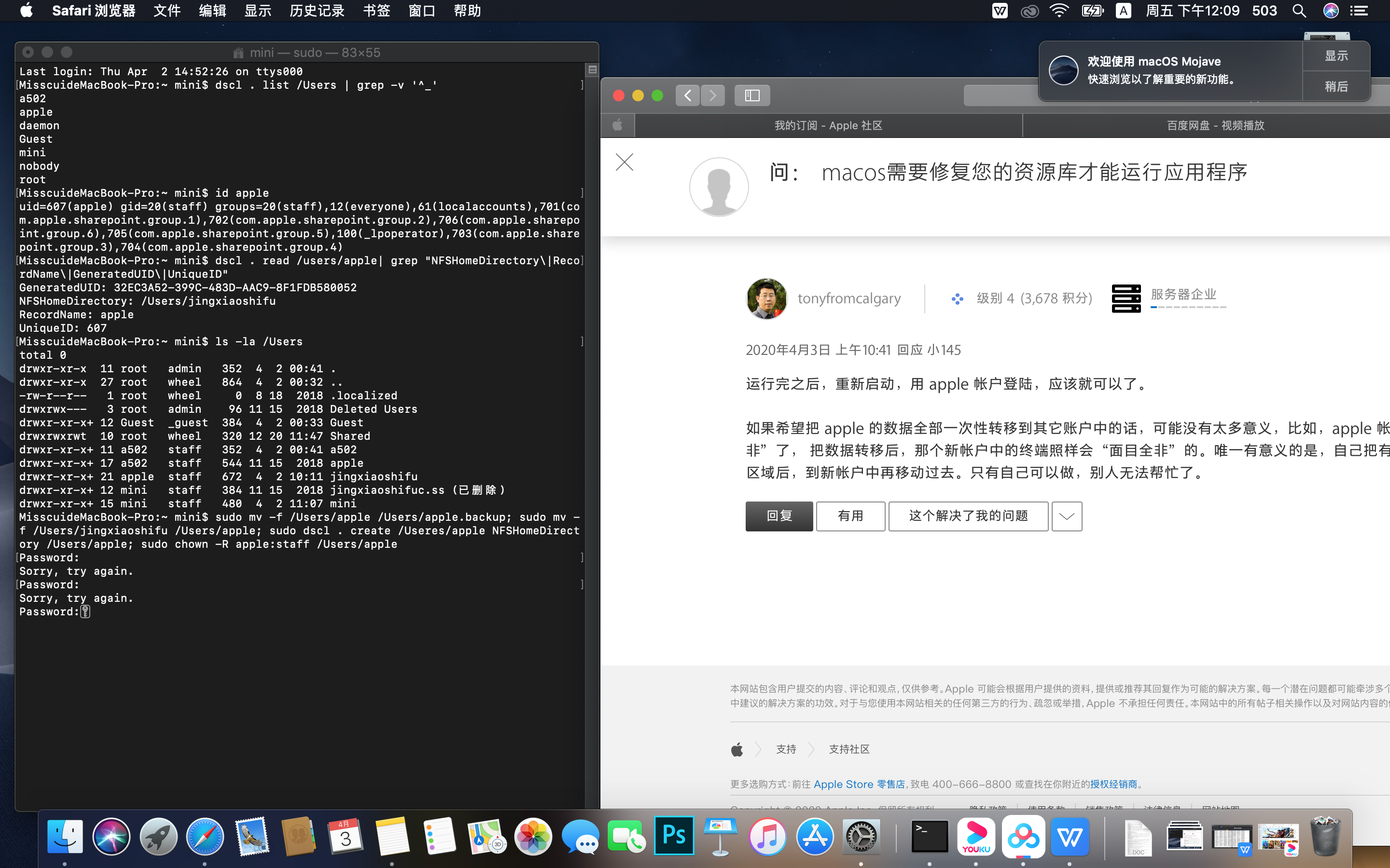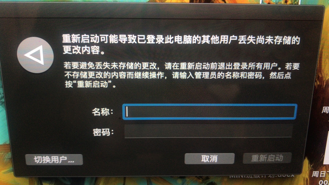 因手欠更改了用户id和用户名导致重启后界面等全都变了样,一直显示macos需要修复您的资源库才能运行应用程序!但是我并不知道密码。怎么解决