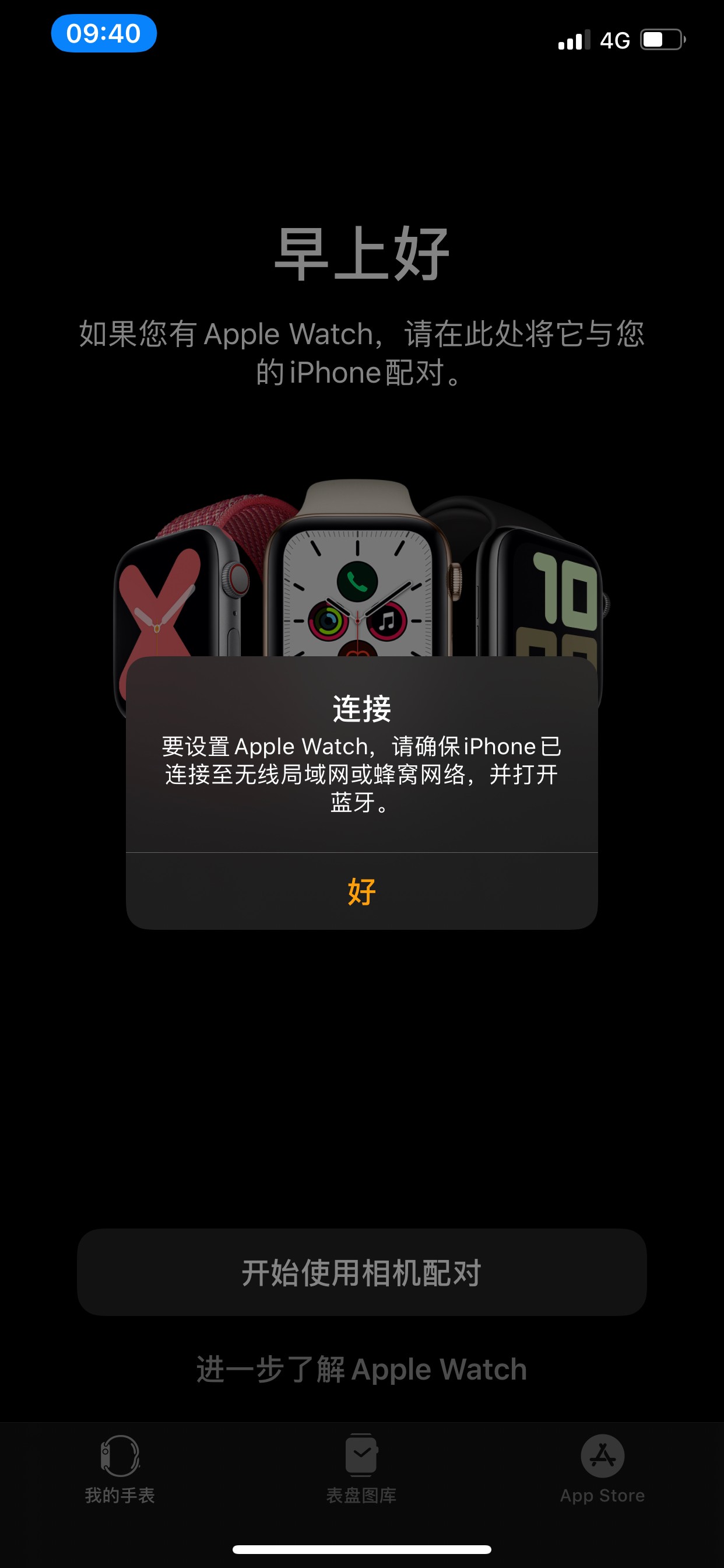 但是iPhone上点开手表APP,点“开始使用相机配对”始终提示“要设置apple watch,请确保iPhone已连接至无线局域网或蜂窝网络,并打开蓝牙”