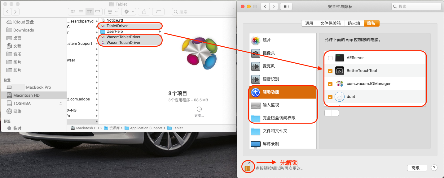 也可以升级到 macOS 10.15 下载最新的驱动程序安装(有个细节要注意,安装驱动后 30 分钟内必须打开应用并在“安全性与隐私”中开启允许访问)之后参考官网说明的方法还不行的话可以尝试手动把所有 Wacom 组件添加到“安全性与隐私”中。
