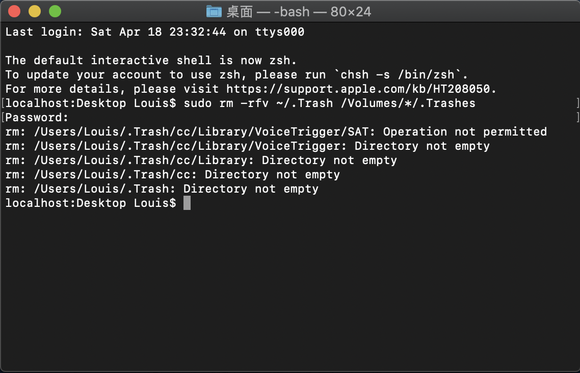 sudo ls -hale@RO ~/.Trash/cc; sudo chflags -R nouchg,noschg ~/.Trash; sudo chmod -R -N ~/.Trash; sudo chmod -R -I ~/.Trash > /dev/null 2&>1; sudo ls -hale@RO ~/.Trash/cc