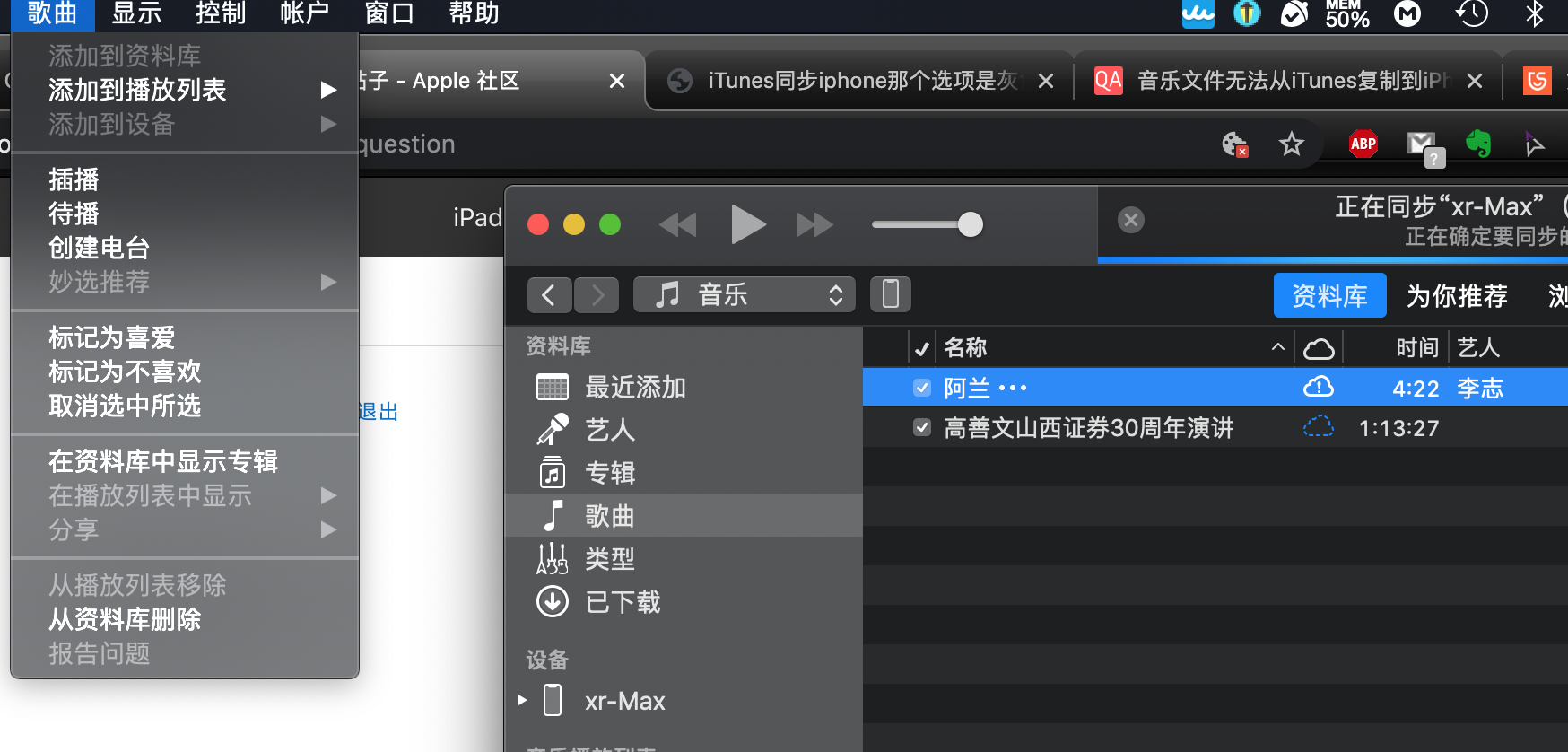 需要把“阿兰”这个音乐文件传送到手机,但是,“添加到设备”选项是灰色;iTunes也没有同步音乐的选项
