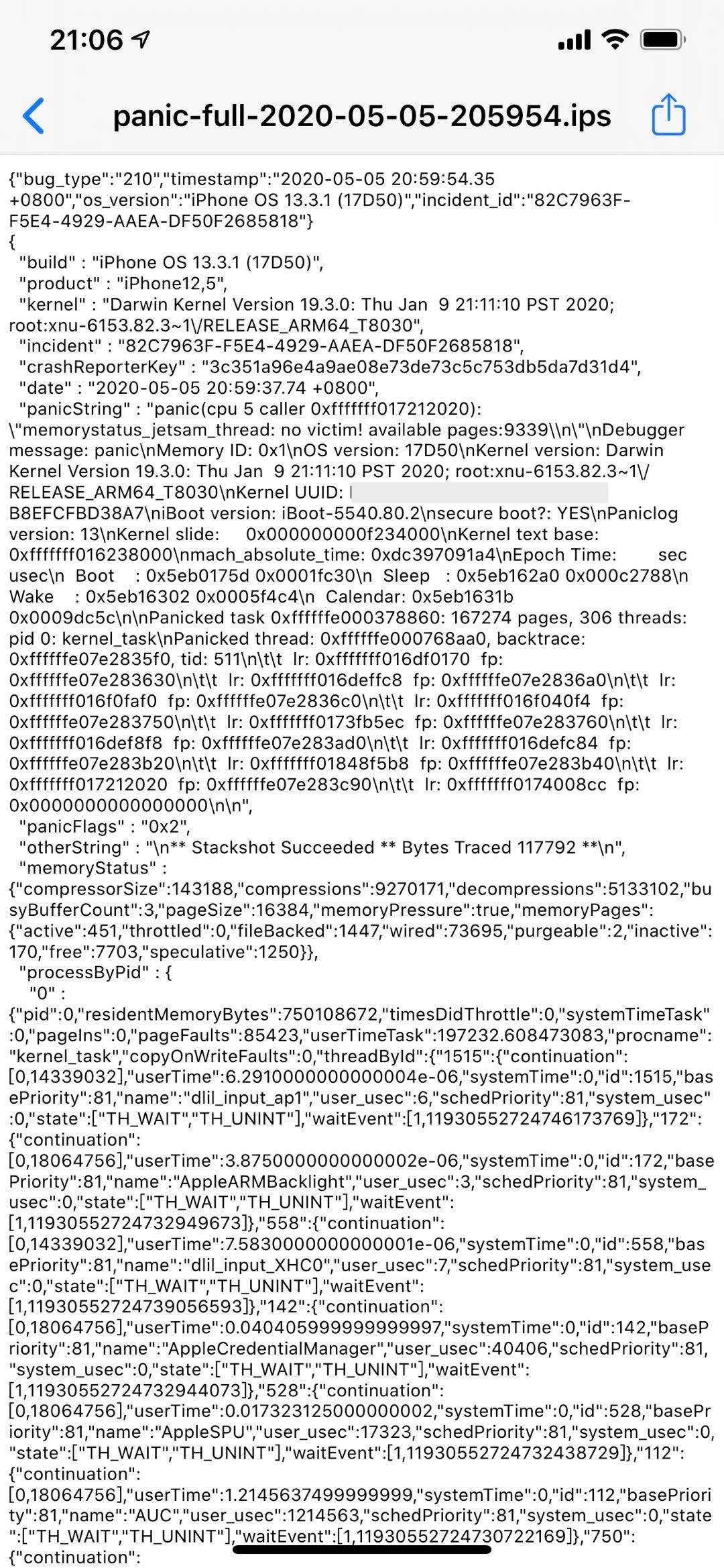 18年刚出的时候换了xs,19年下半年更新ios13之后,明显感觉杀内存,特别是微信,经常退出一下就要重新刷新很长一段时间,接着开始出现app闪退,多任务运行时明显速度下降,一打开相机就闪退,越来越严重变成了自动重启。上网查了帖子,电池老化可能会影响cpu运行,检查了一下发现电池健康值只剩83%,今年3月的时候约了天才吧准备换电池,结果苹果店员打开数据分析,发现多个panic full记录,跟我解释这是主板问题,而且机子已经过保,换主板太贵,建议我以旧换新。其实第一个panic full出现在19年9月,当时还没过保,如果早发现说不定可以在保内维修。