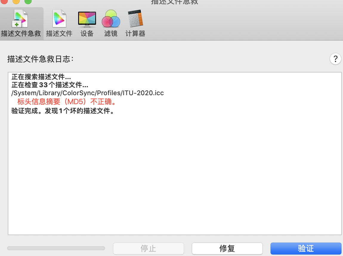 在 Mac 上的“色彩同步实用工具”中检查和修复颜色描述文件