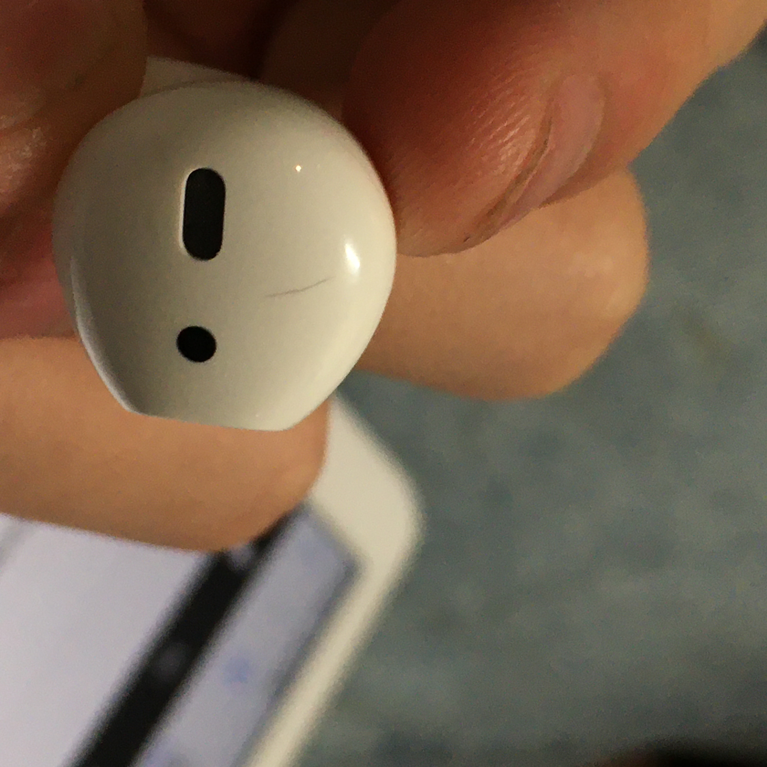 昨天网购的AirPods二代 是全新 开箱也没问题 今天拿出来看左耳机有黑色裂痕但是今天没有摔或者摩擦耳机 确实是看得出来是裂开了不是划痕😭
