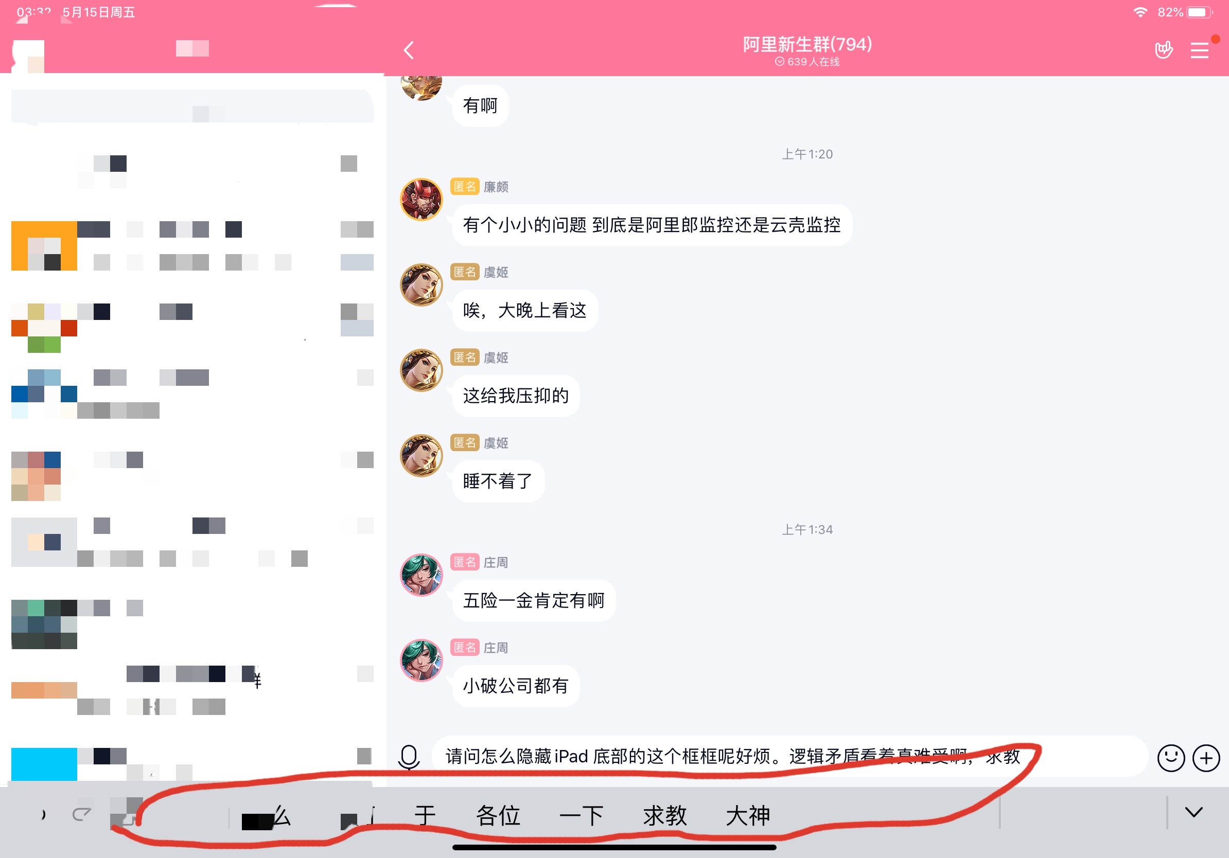 在使用 iPad pro 的新款妙控键盘的时候,每次输入文字之后,最底下带个各种功能键的那条能不能隐藏呢?因为每次输入文字之后下面那个框都会自动联想,这是属于典型的触控交互的思维,在桌面模式下使用实体键盘我肯定不会通过触控去选择它。此外这个横框还会阻挡住部分 slide 小窗应用的输入框,如微信,强烈建议删除这个候选条,改成和 mac 一样的交互体验。只需要简简单单的输入框和候选词,足矣。在很多应用里面输入中文,屏幕下方极大概率会出现一个联想词条,会导致接下来的空格键、方向键失效等 ,也会导致很多应用的 UI 错位,比如微信中这个条会挡住主界面下面的四个按键。。。