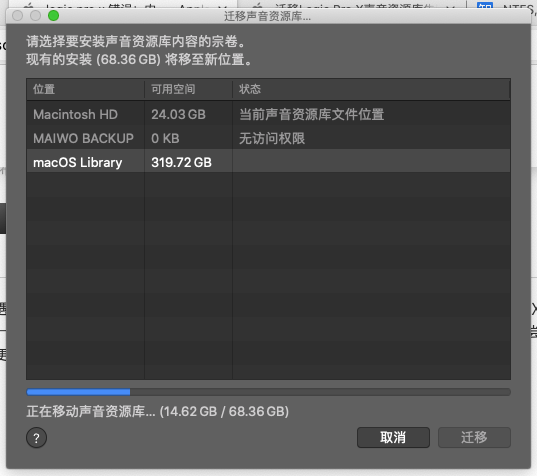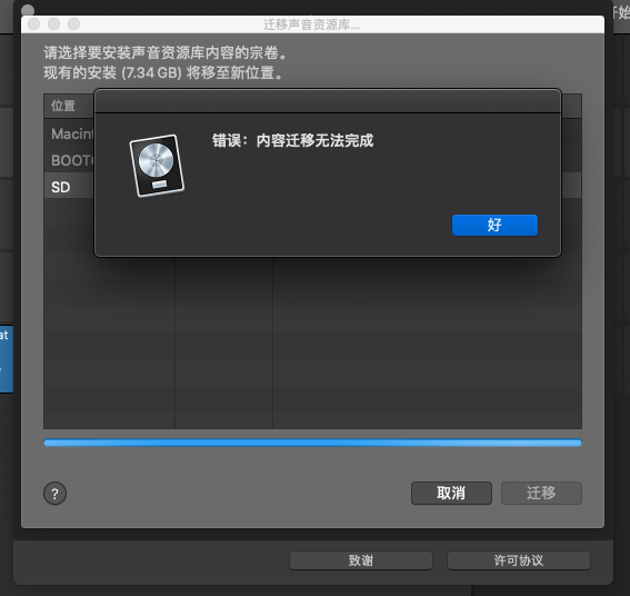 logic pro x 在2017款MacBook air里面迁移声音资源库一直显示“错误:内容迁移无法完成”