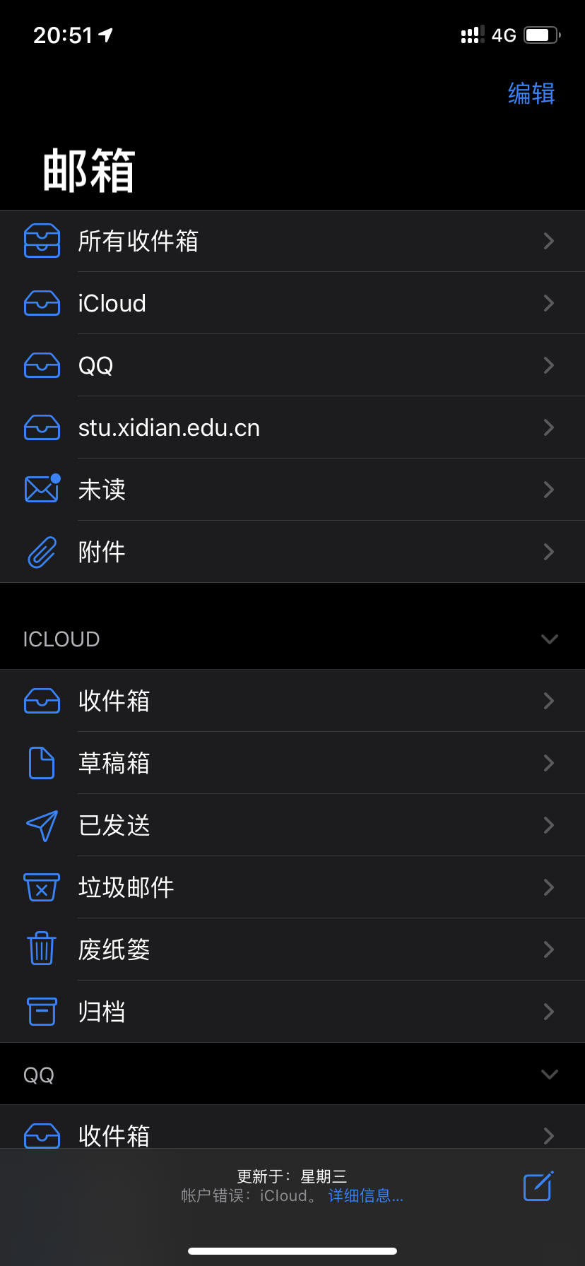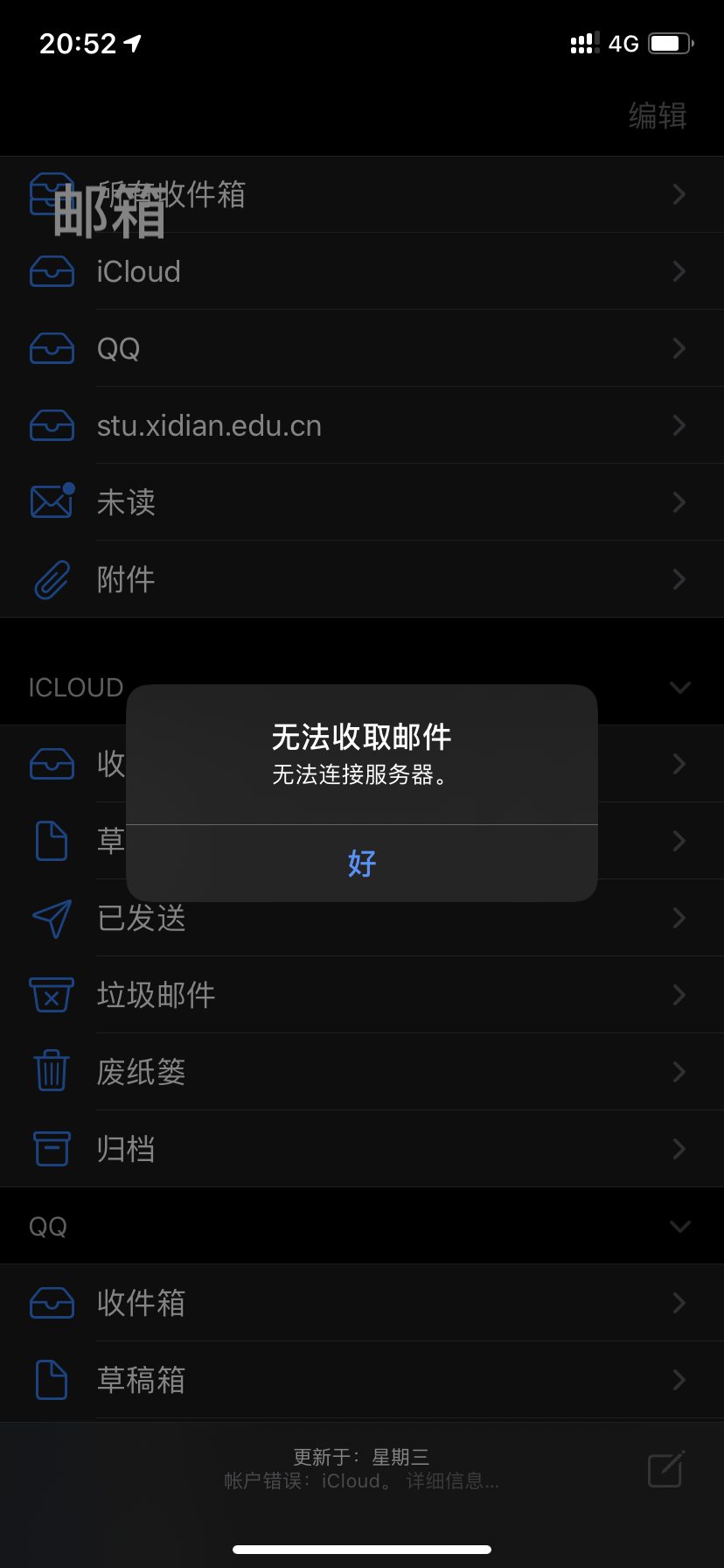 如图所示,icloud邮件不能获取也不能发送,总是显示无法连接服务器,移动网络、wifi等各种组合切换的可能都尝试过,也不能收到邮件,两天内重启更是重启了好多次了。
