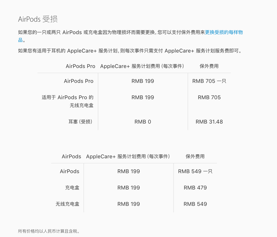 如果任一只 AirPod 在打湿后损坏,您可以与我们聊天或通话以订购更换件。