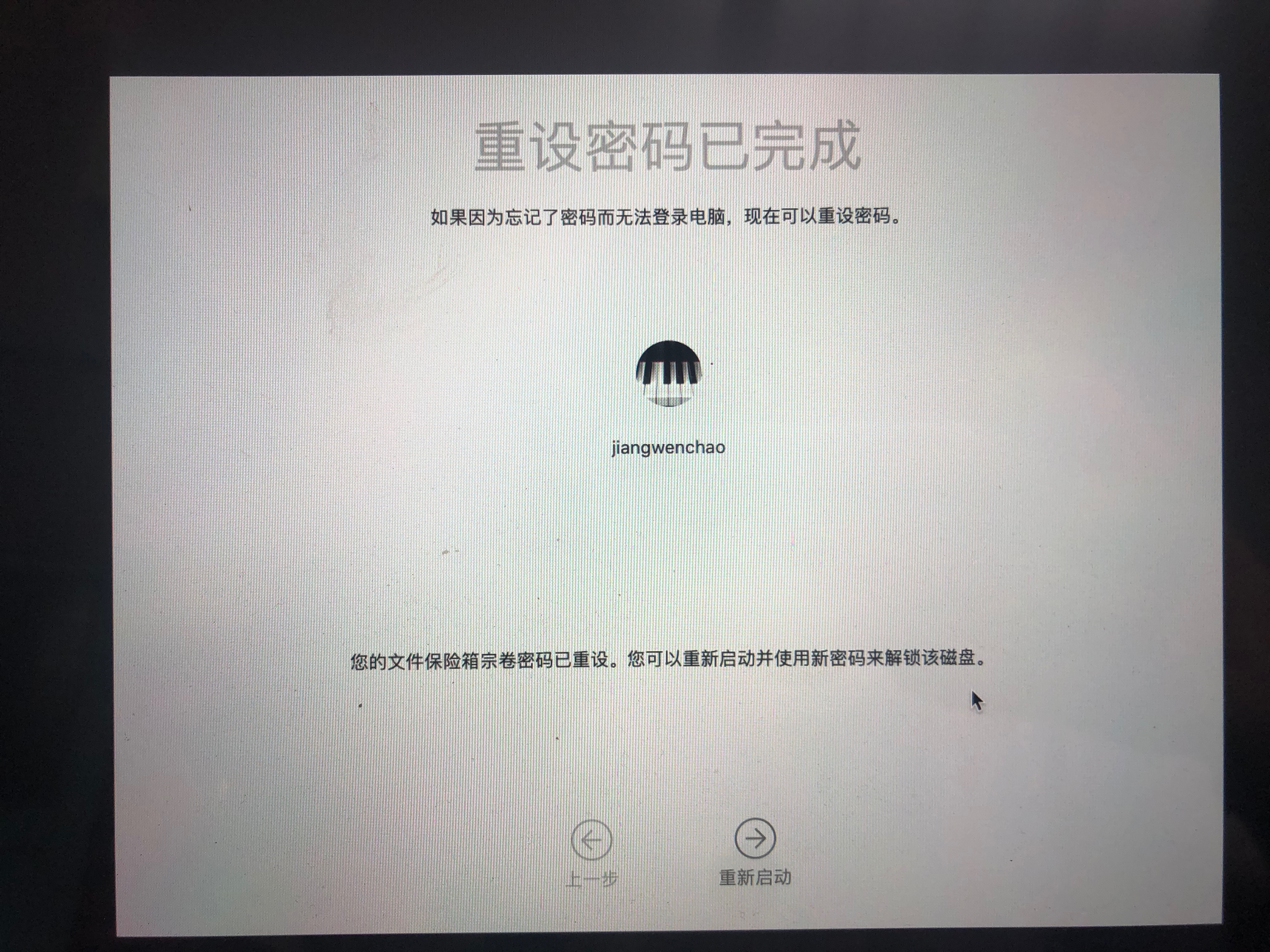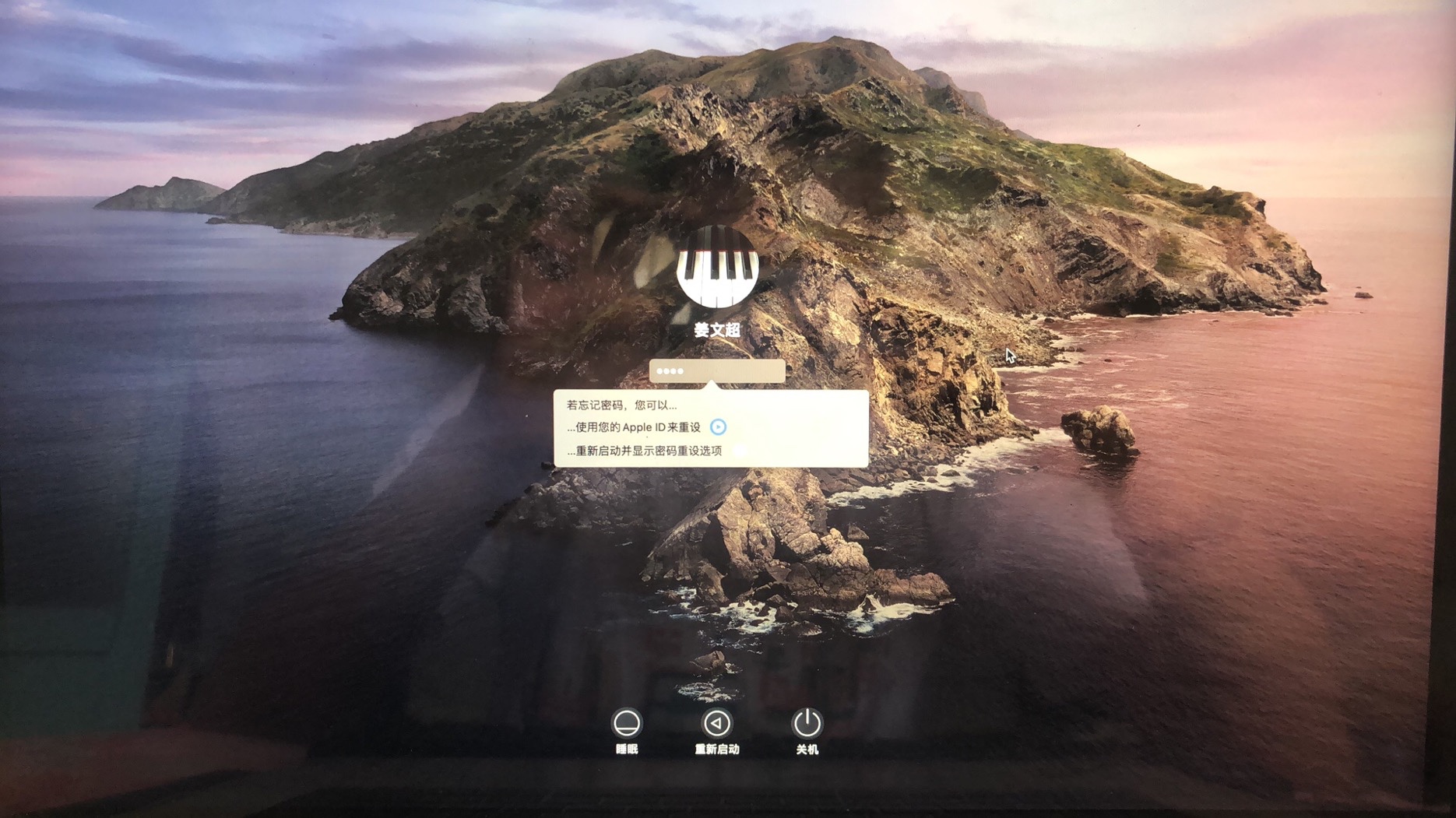 开机界面输入开机密码后,密码正确开始读条,读条完毕又显示如上界面,要求再次输入密码,此时尝试任何密码都不能开机,于是我通过Apple ID重设密码,重新开机,第一次依旧正确,读条完毕还是出现了以上界面,输入新密码依旧不正确,旧密码也不正确,重设了四次,均卡在这个界面.