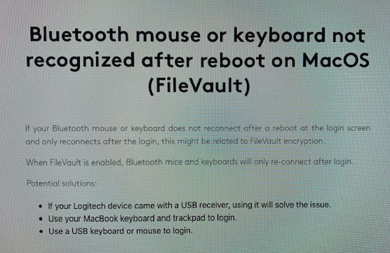文件保险箱启动时,不是完整的macOS系统,只是文件保险箱自己的用于验证帐户的最最基本的系统,此时只有匹配过的Apple自己的键鼠设备才会被支持连接,第三方的设备“都”不支持,前面shmily的那张图中说的使用Logitech的接收器可以,这就看NVRAM(Logitech的接收器)里面是否能记录下匹配设备了。