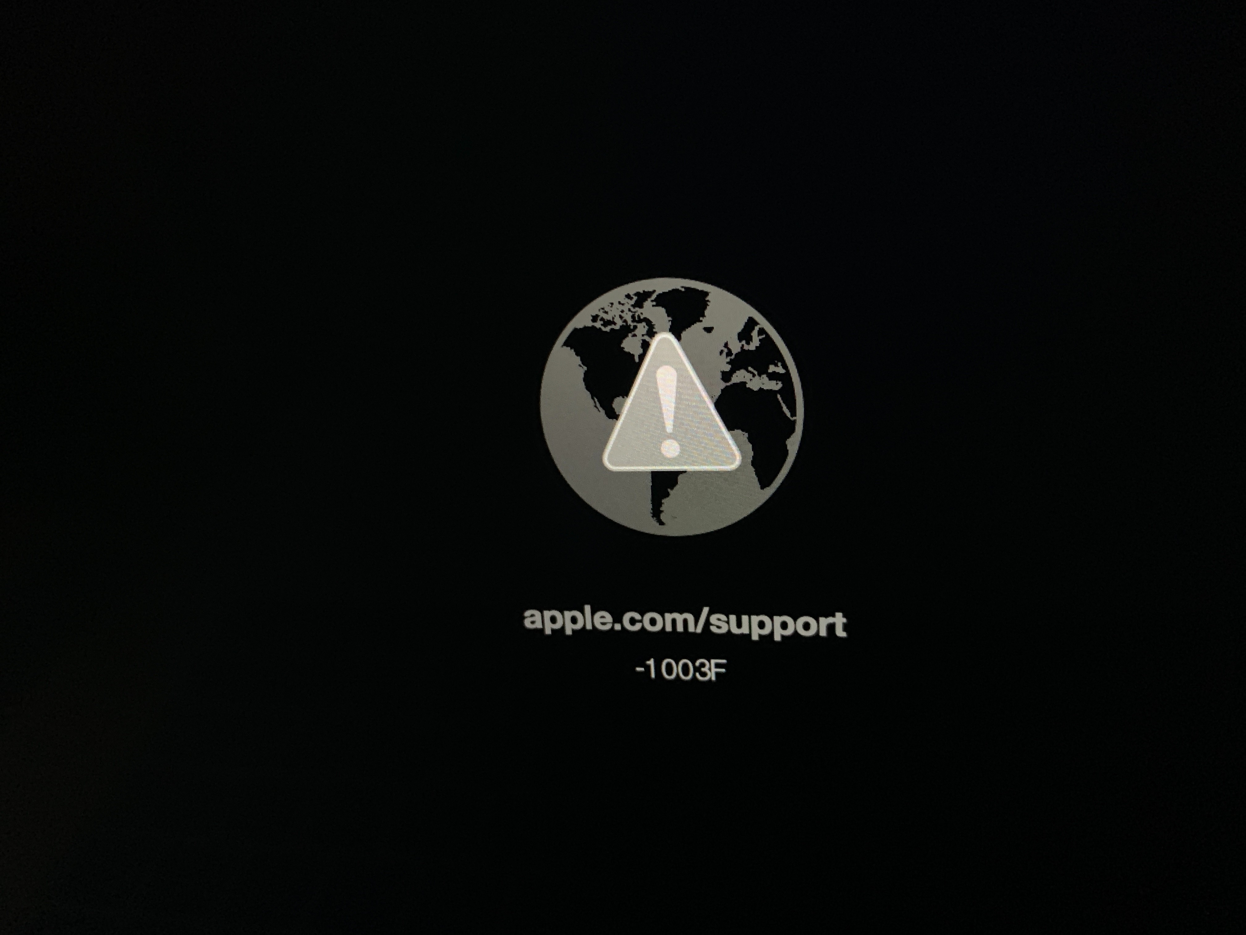 请问macbook pro,突然出现问号文件夹,重新开机后按option+command+r后出现地球并选择网络输入密码后~出现-1003F的提示,依然无法开机,但开的时候响了1下,之后一直黑屏直到出现问号文件夹