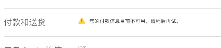 没办法在MAC上使用APP store购买软件,然后按照提示在官网管理ID,付款和送货这块就提示:您的付款信息目前不可用。请稍后再试。
