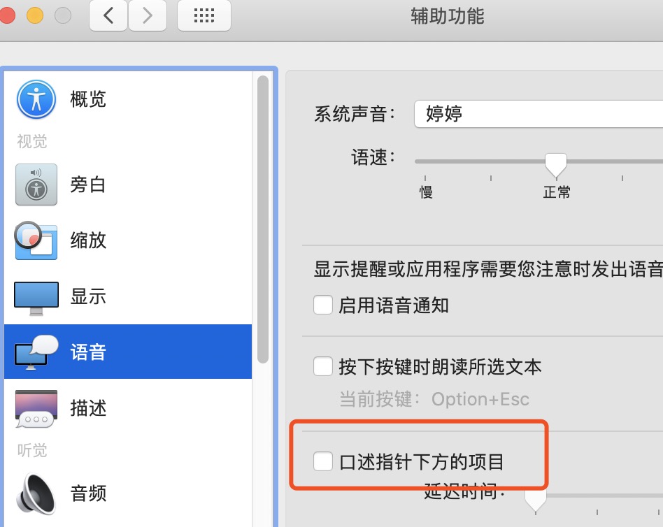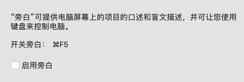 Macbook Pro 2017版本 更新到Catalina系统以后,旁白选项关闭无效,还是会有语音读出鼠标的操作。始终无法关闭
