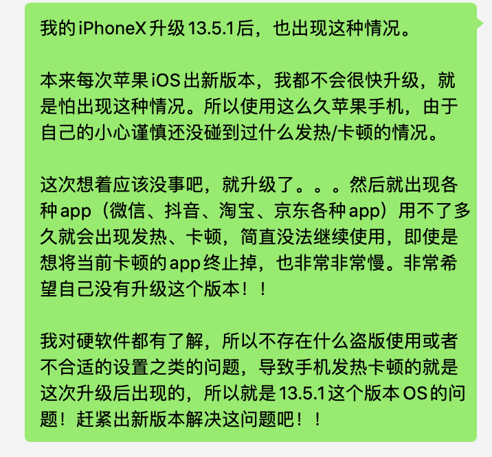 用iphone很多很多年了,这次是我经历的比较严重的发热/卡顿,所以还是希望他们赶紧解决,不要影响我的正常使用。现在是任何时间用一会,就不行了。看来我的每周屏幕使用时间要下降很多了 。。。。。。。。