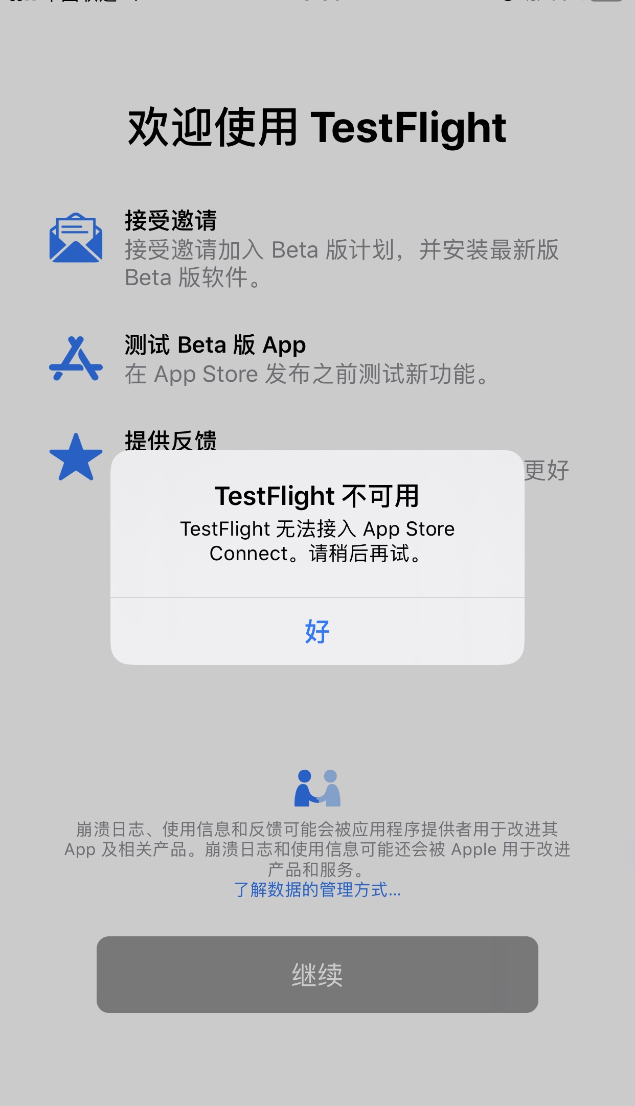 我准备下载一个内测app,通过TestFlight下载,但是它显示TestFlight不可用、TestFlight无法接入App Store Connect。一直都下载不了内测app了