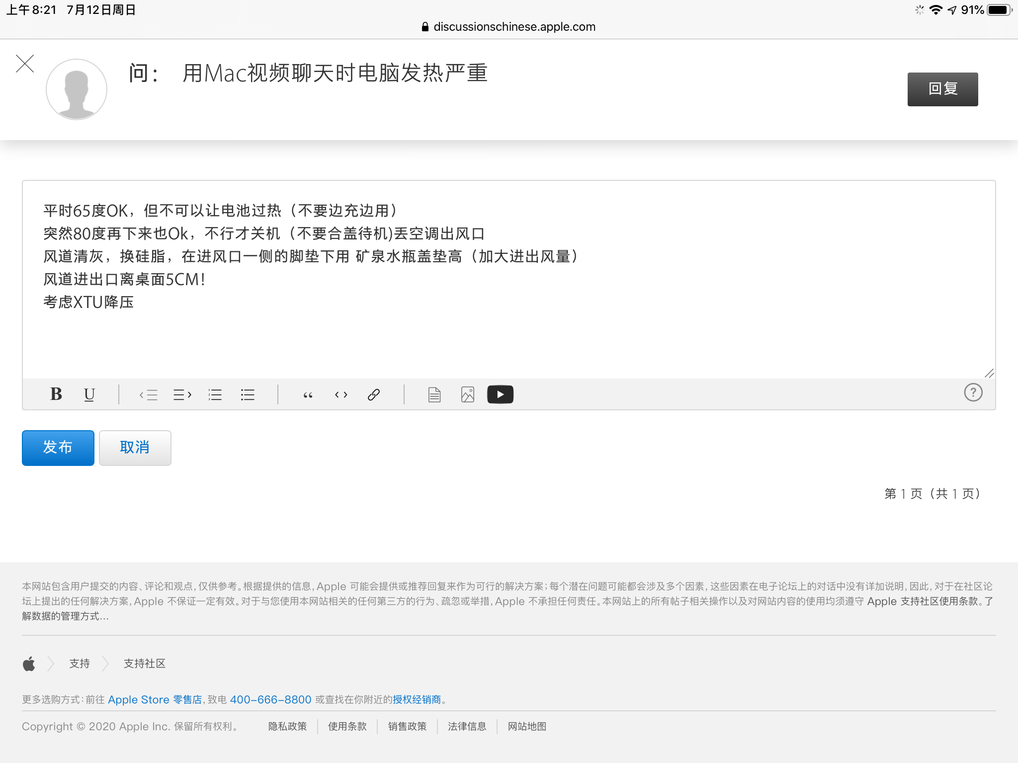 为此我已经做过以下尝试:关闭Safari等程序,重启电脑,保持最新的系统和应用,重制SMC。但都是在视频开始一段时间后发热风扇开始狂转。希望解决。
