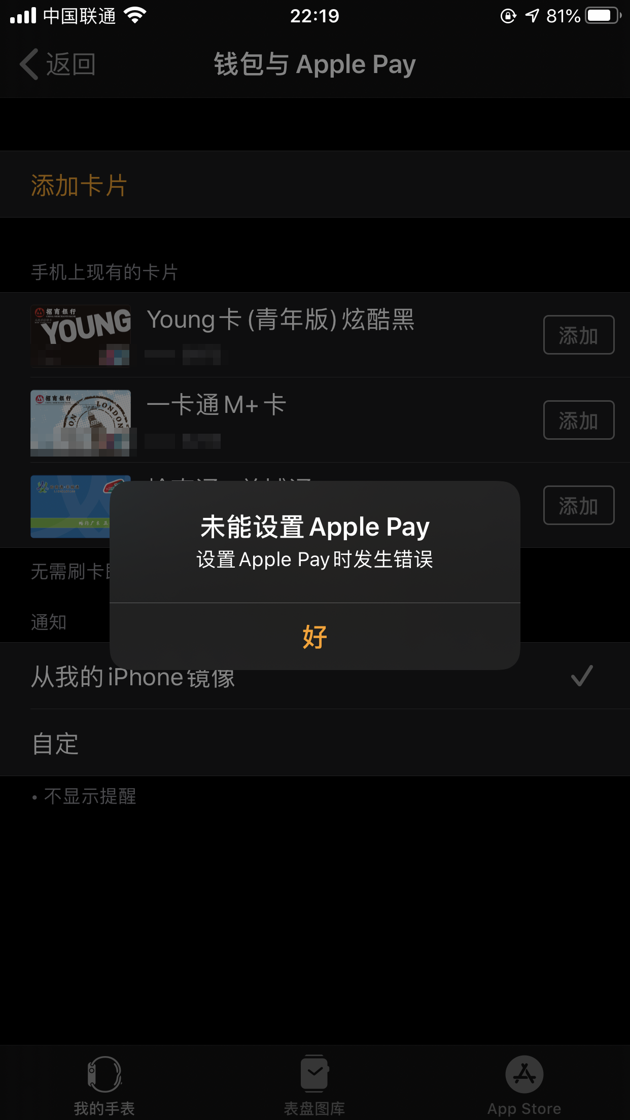 后来手表修好,恢复之前的备份,发现信用卡添加不上,如下图所示;