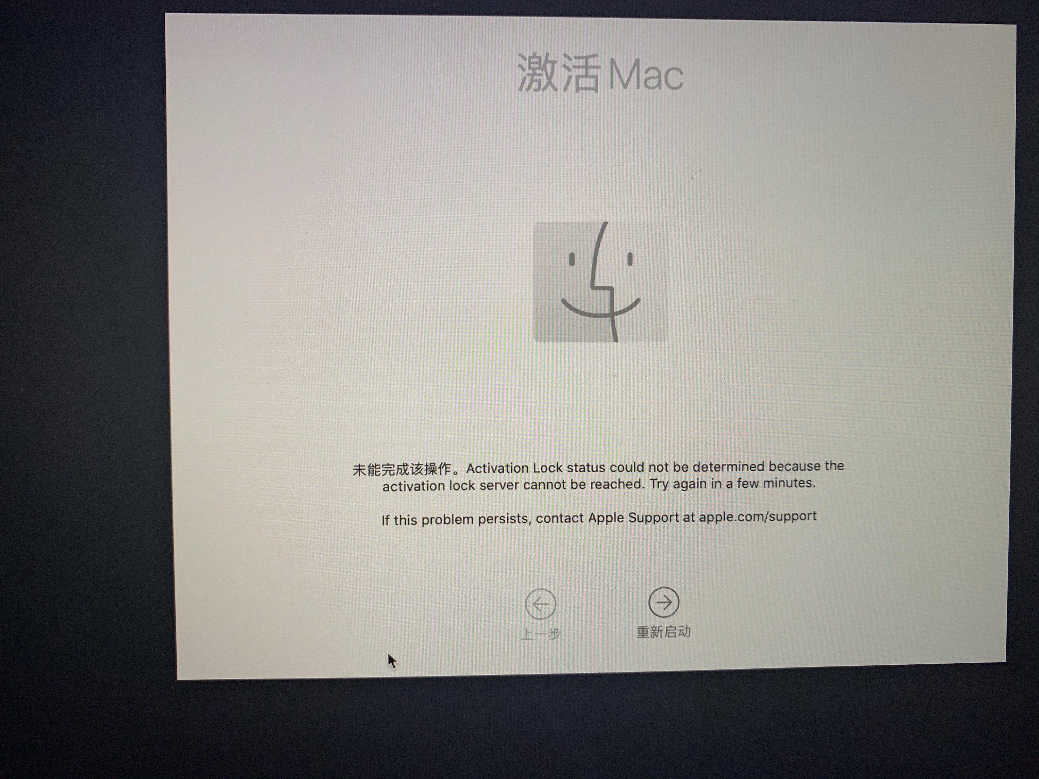 恢复电脑失败,抹掉Mac后启动电脑自动进入恢复助理要求激活Mac,但是激活服务器无法连接。请问各位怎么办?附图