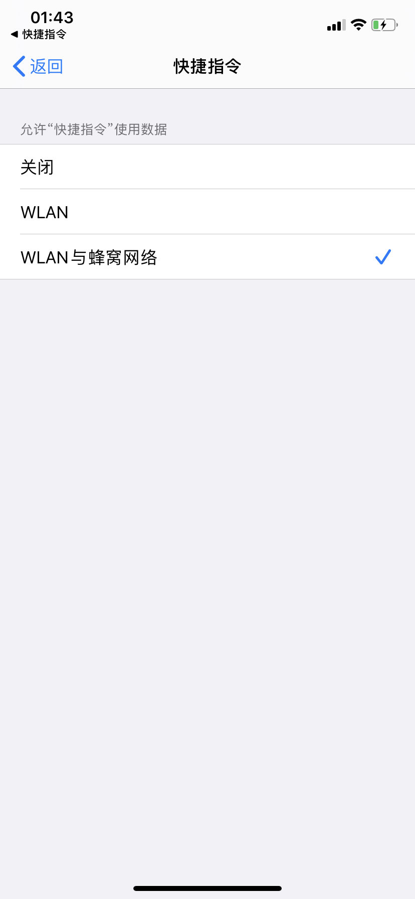 快捷指令显示需要在设置里允许访问数据,但是我设置"WLAN与蜂窝网络"后它自动改回了"关闭"