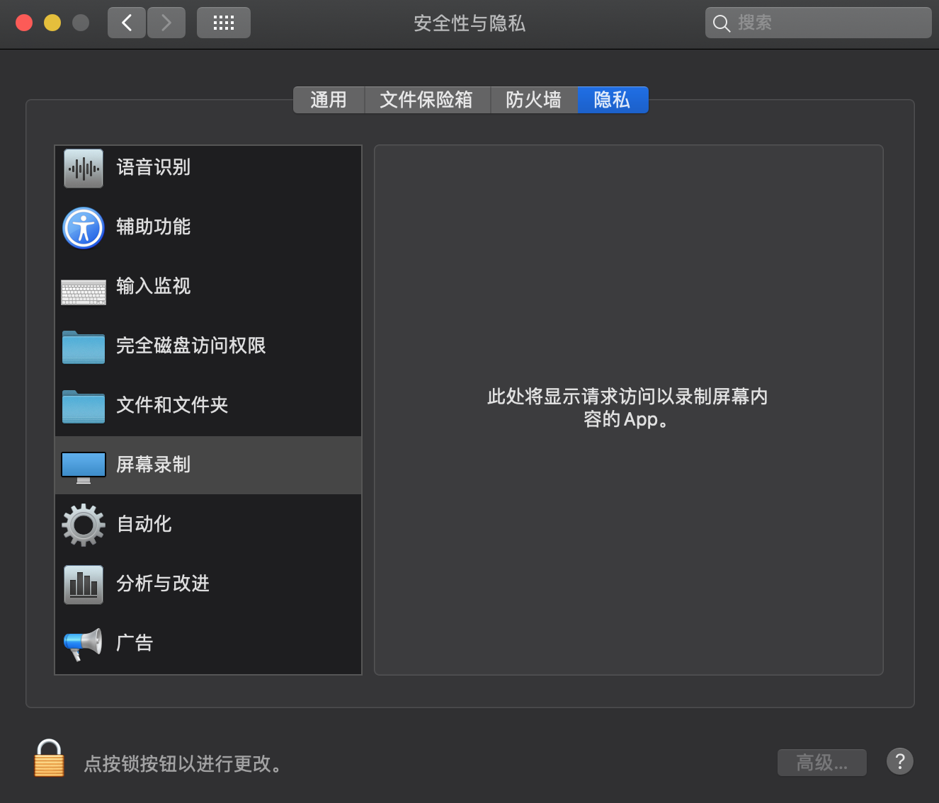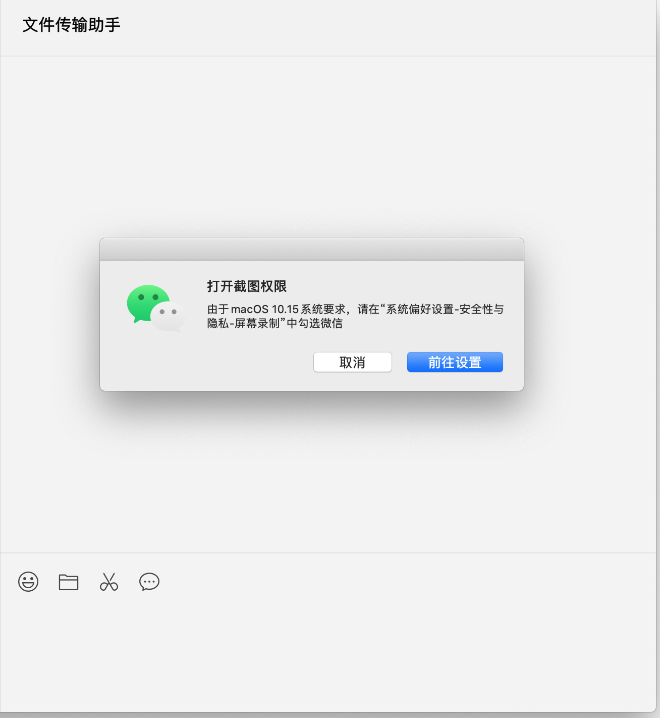 微信中使用截图功能提示打开截图权限,但是在弹出的屏幕录制选择窗口中并没有微信的选项,这个问题在我的另一台macbook pro上是没有问题的,但是我的这台重装了几次系统也是不行。