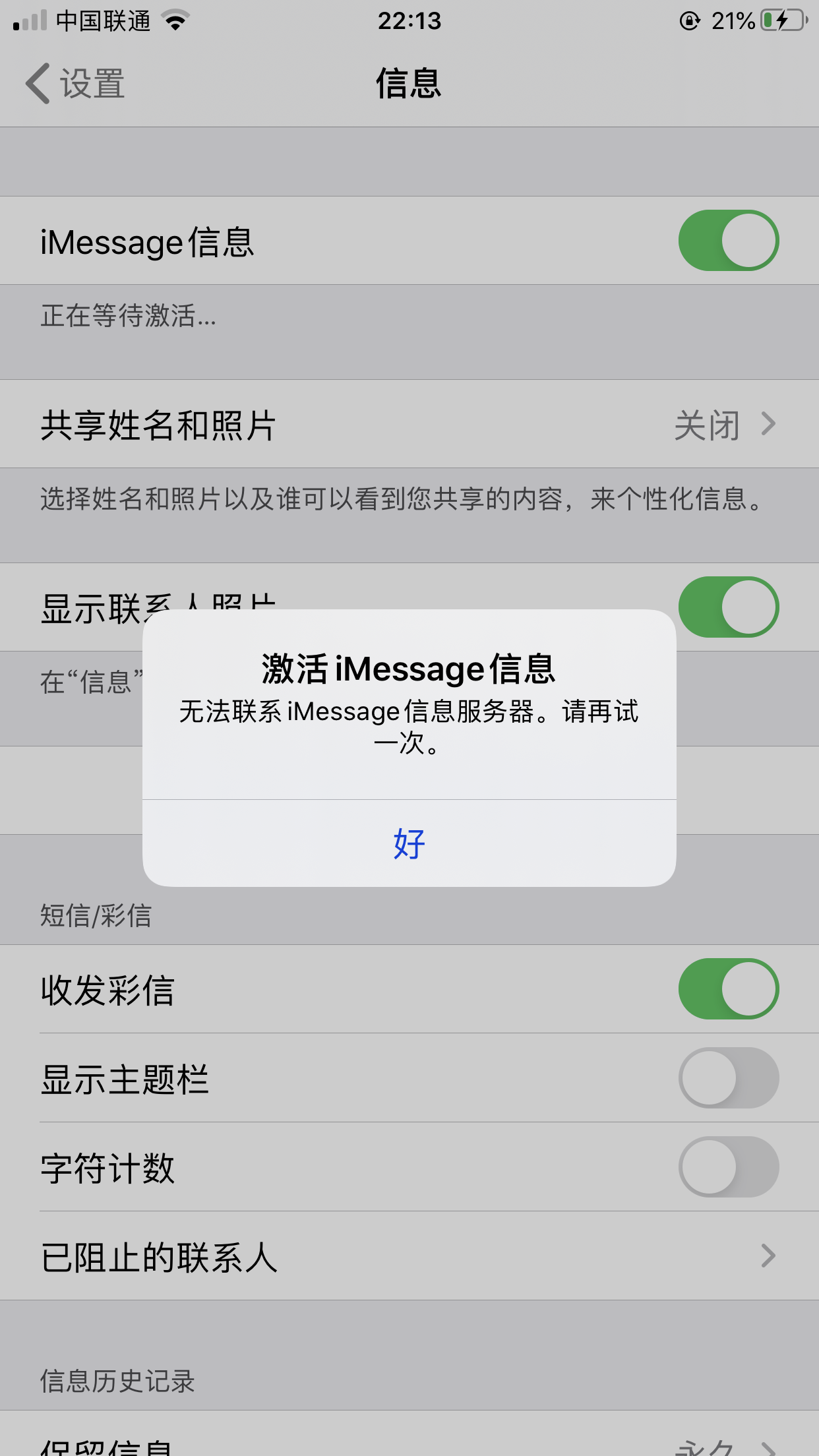 激活 iMessage 信息或 FaceTime 通话时,您可能会看到以下这些信息: