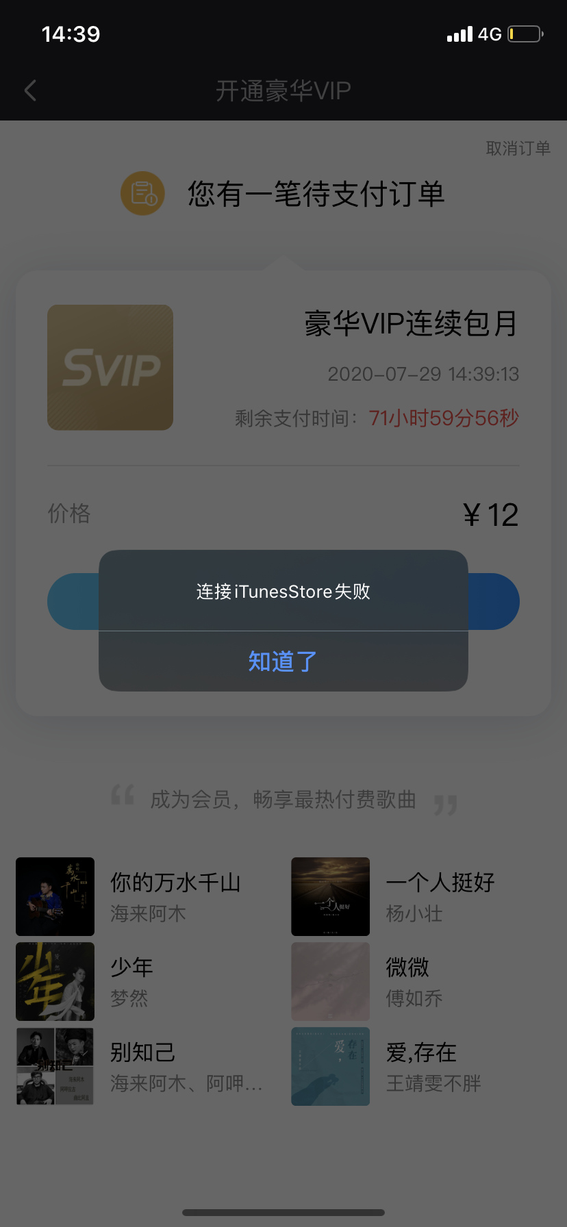 在酷狗上购买音乐包我的时候一直显示无法连接,然后支付失败