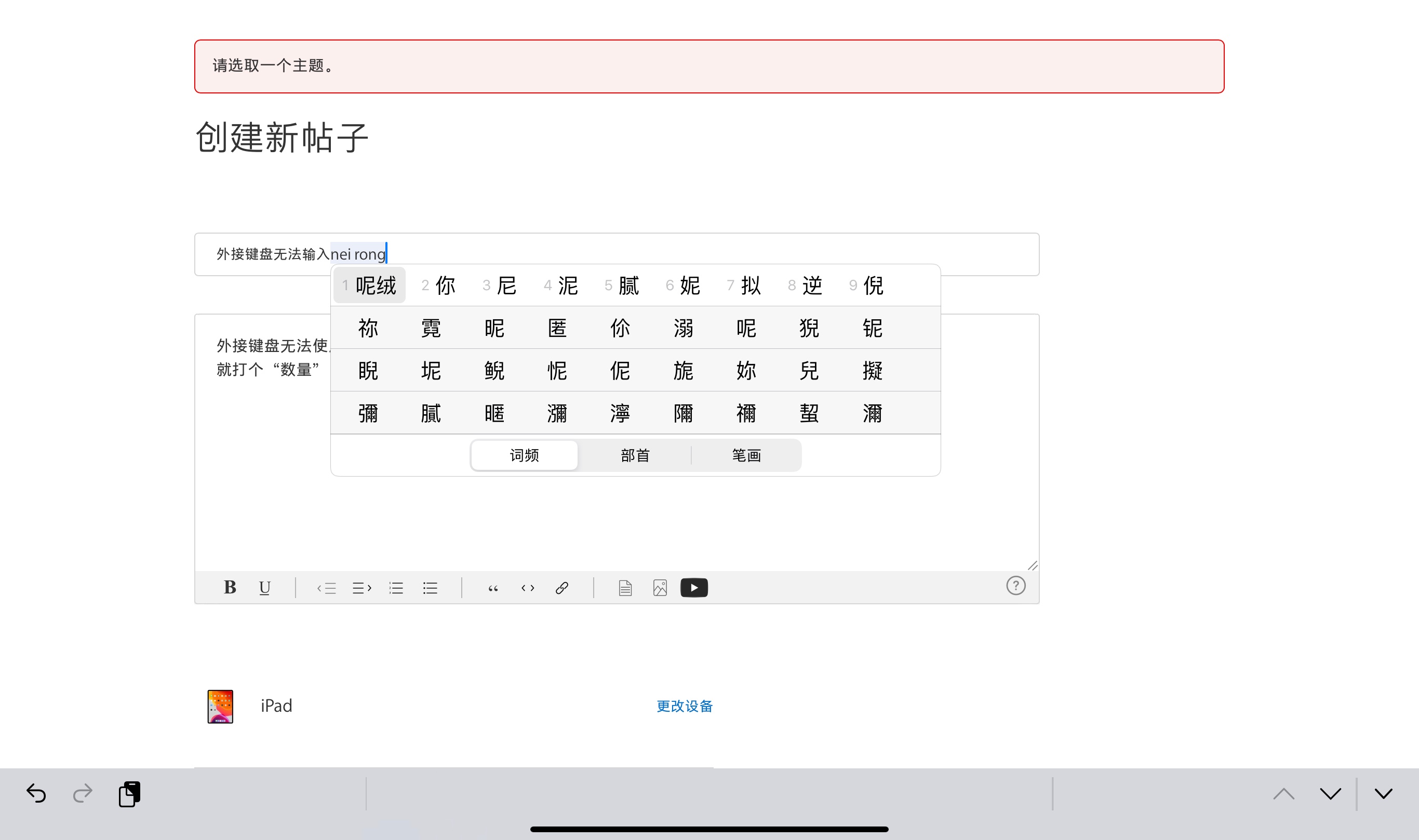 就打个“内容”,出来的 是 什么?打其他词语也一样,ipad 外接键盘 就像喝醉酒了一样。