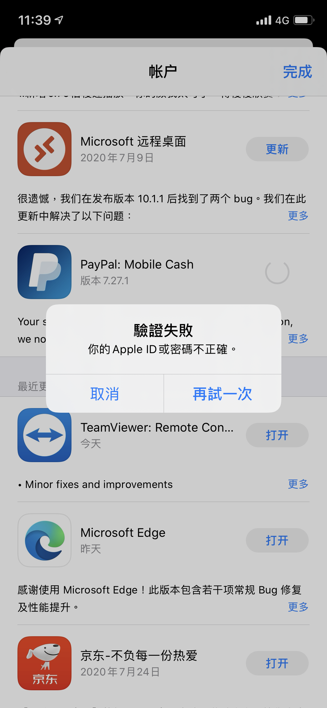 - 账号明明正确也可以在「设置」中登出-登录,但是在AppStore更新应用时总是重复提示「密码错误」