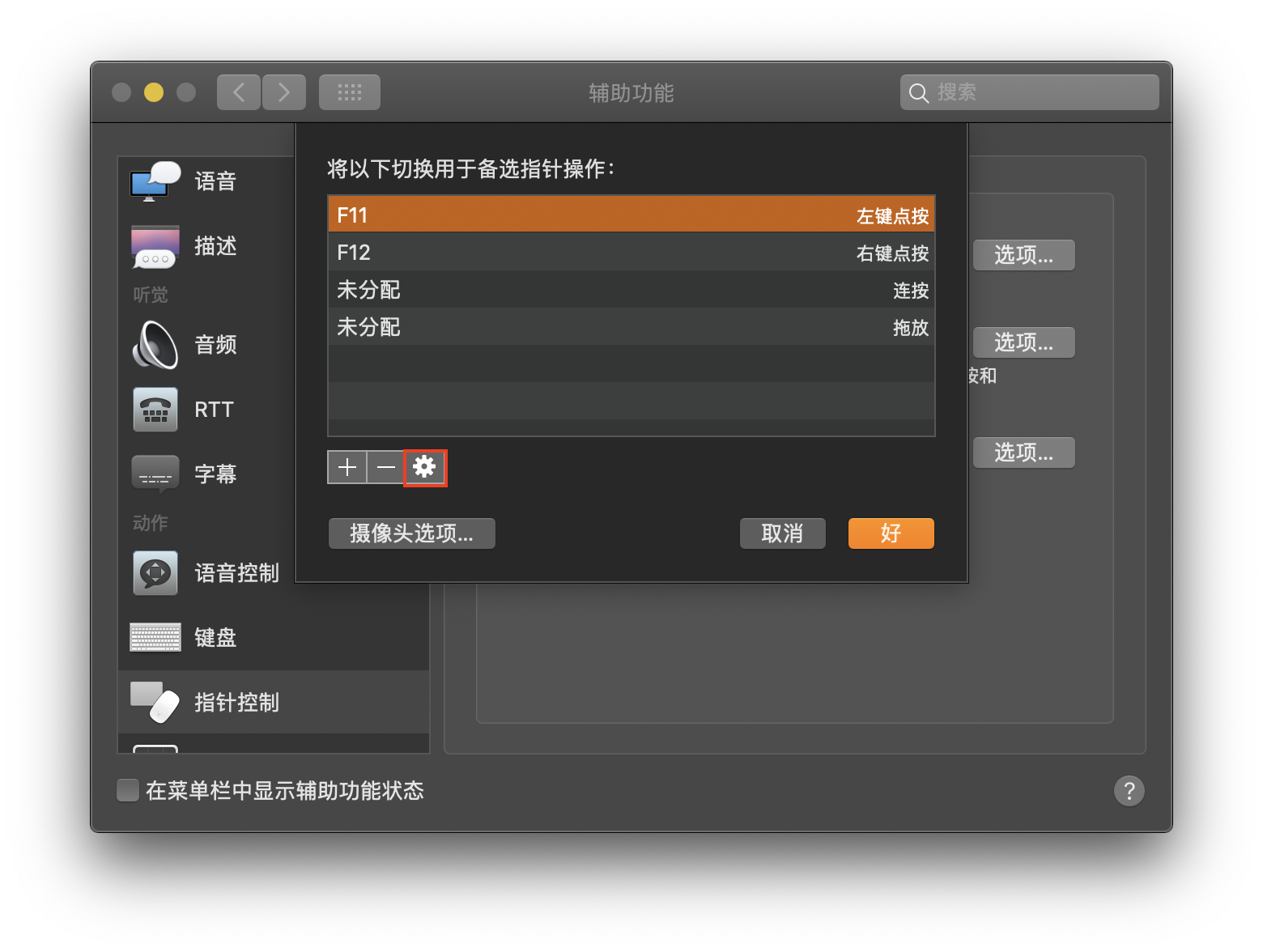 但在辅助功能中好像不能定义多个任意按键和组合按键,试了下只有 ‘tab’、‘空格’、‘delete’和回车键有效,如果设置的按键不便于操作也可以用一些第三方软件来实现,例如 BetterTouchTool 就是一款很不错的自定义快捷键插件。