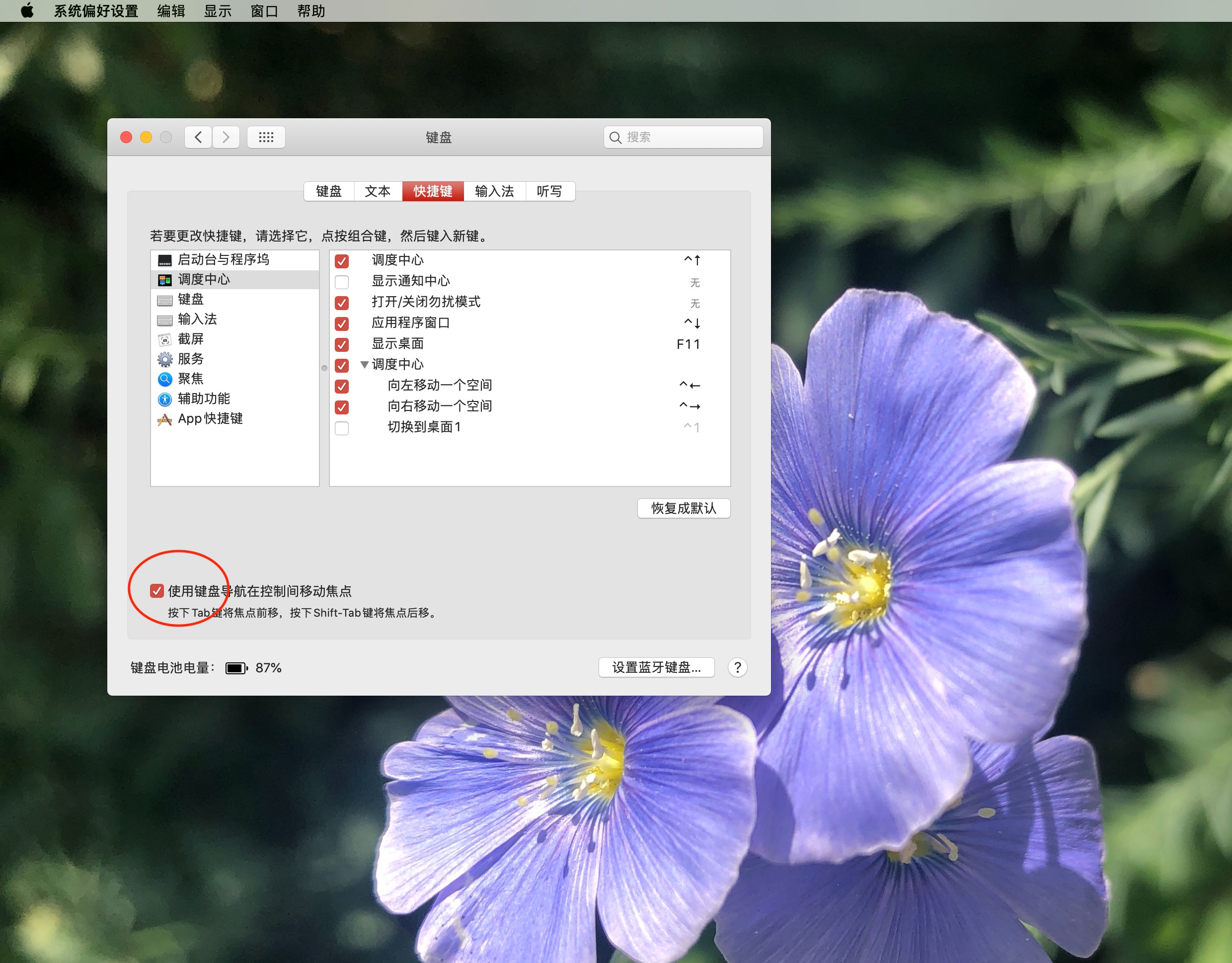 打开启动台,系统偏好设置,键盘,快捷键,如下图,然后就可以使用TAB键切换选择,空格键进行确认操作啦!