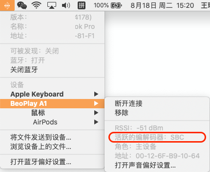这个问题一点点排除,甚至也可能是编解码器的问题,我这边用蓝牙音箱连接测试显示的编解码器您可以参考一下。