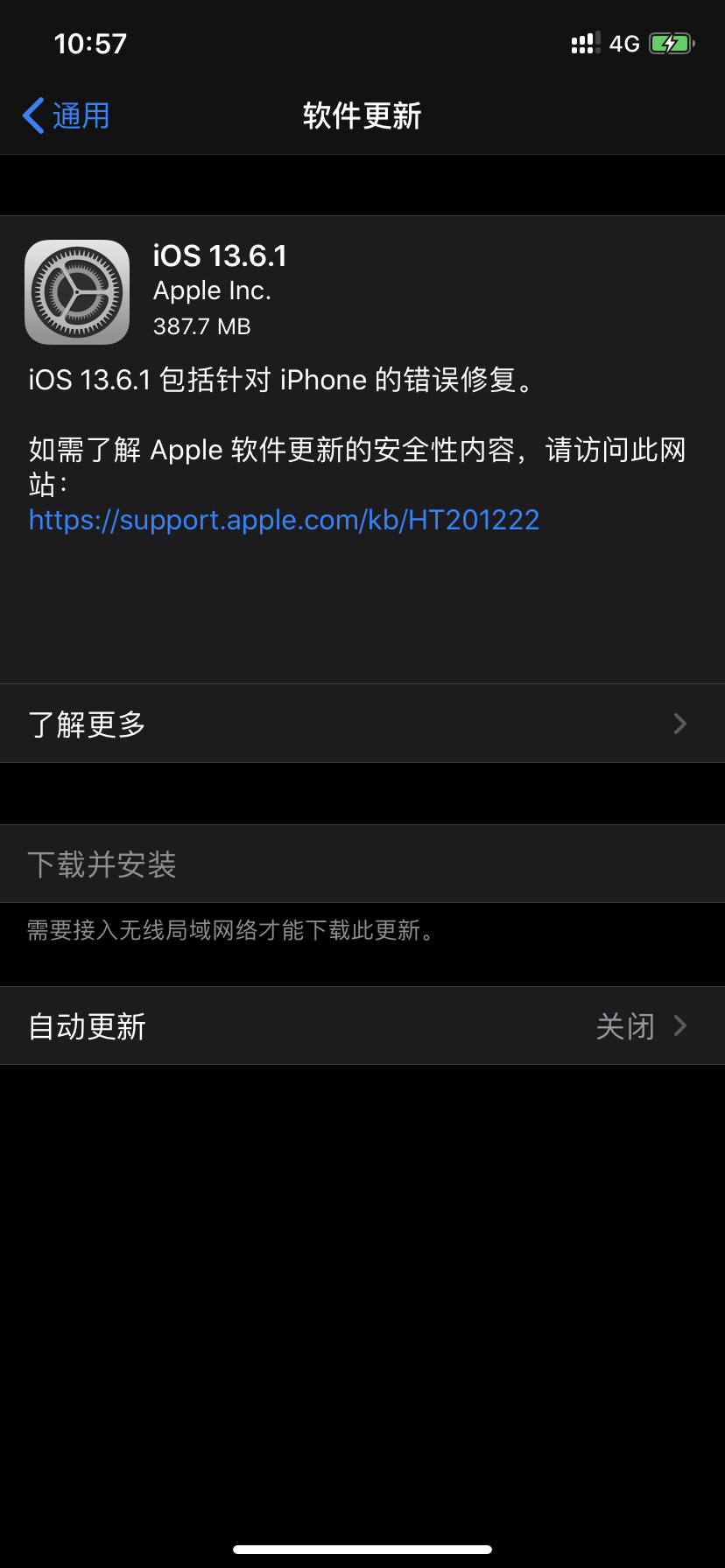 已经允许“设置”使用“WLAN和蜂窝网络”,软件更新的“下载并安装”是灰色且说明“需接入无线局域网才能下载次更新”。