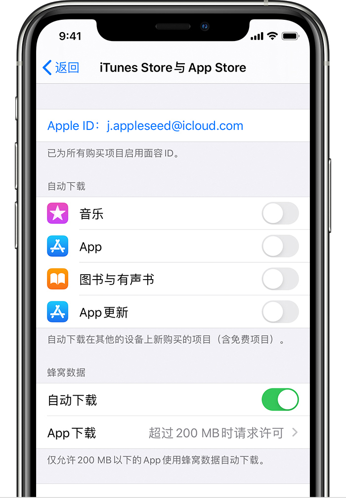 在您的 iCloud 设置或“iTunes Store 与 App Store”设置中查找您的 Apple ID。