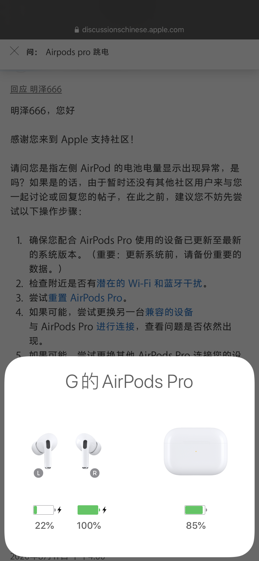 请问您是指左侧 AirPod 的电池电量显示出现异常,是吗?如果是的话,由于暂时还没有其他社区用户来与您一起讨论或回复您的帖子,在此之前,建议您不妨先尝试以下操作步骤: