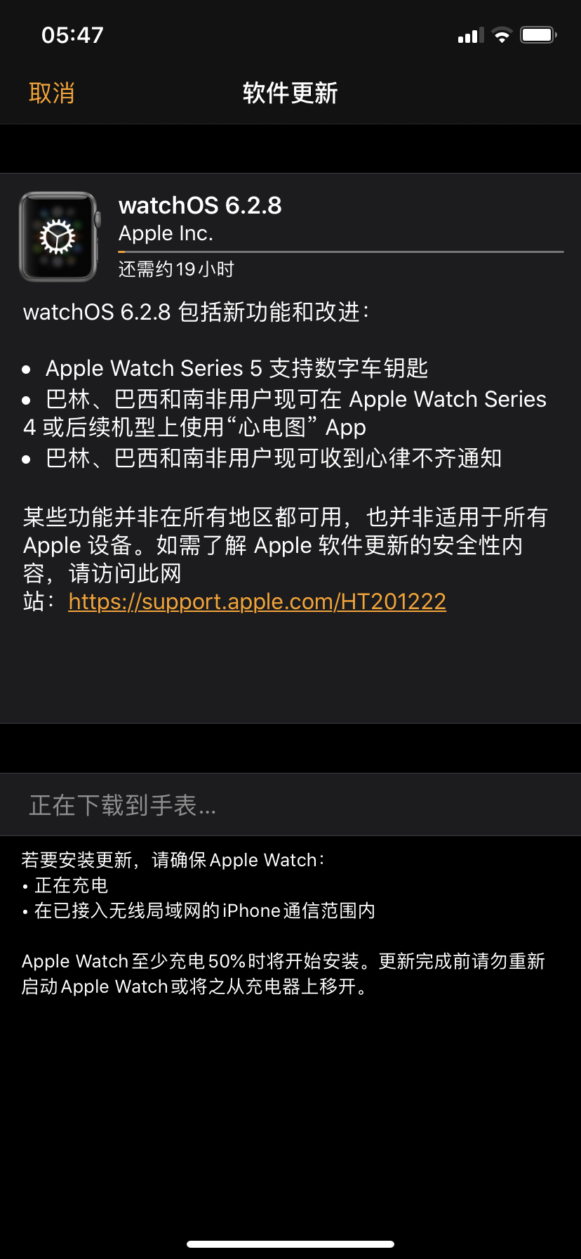 注意:在进行更新时,不要重新启动 iPhone 或 Apple Watch,也不要退出 Apple Watch 应用。更新完成后,Apple Watch 会自行重新启动。