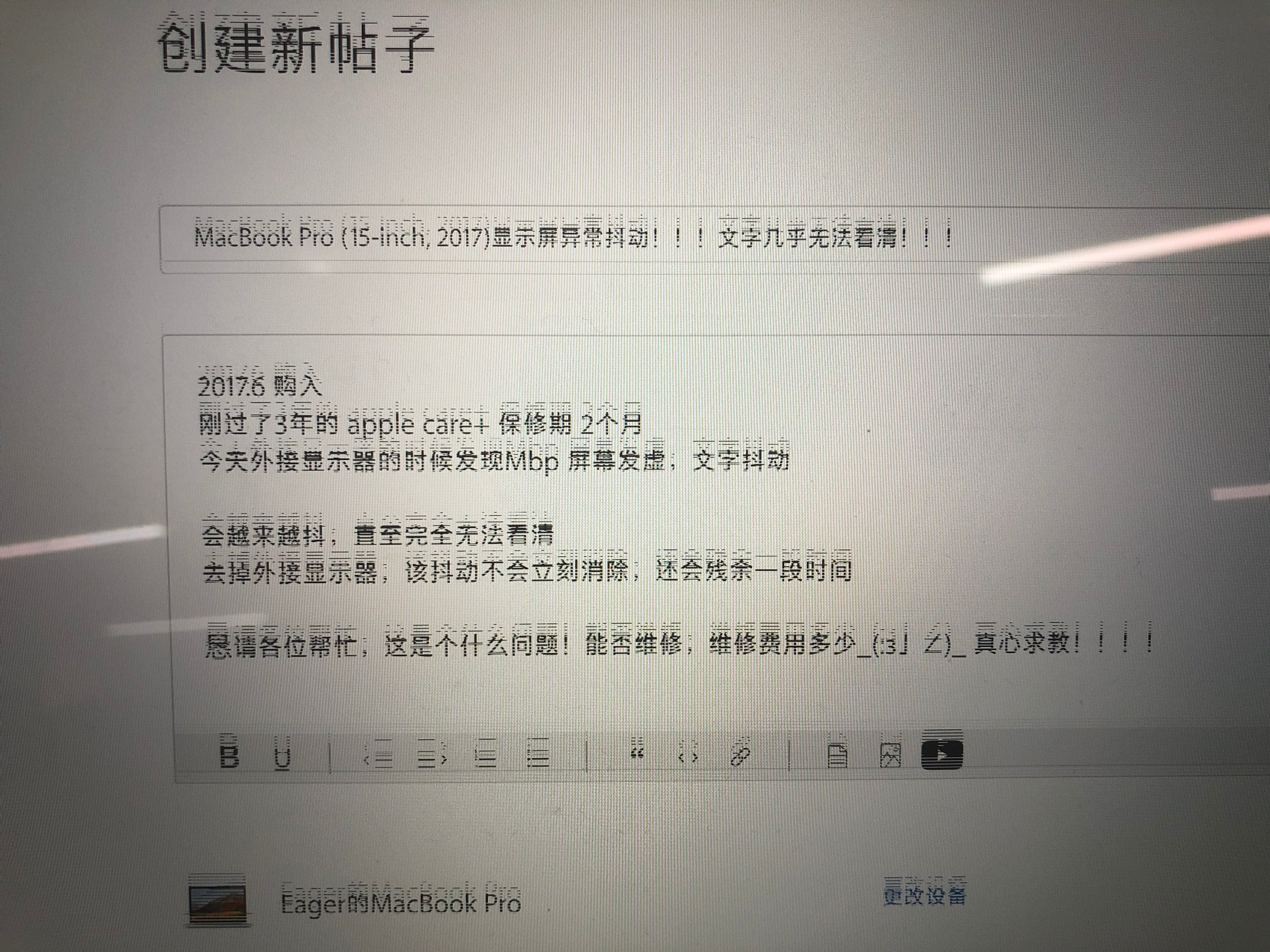 MacBook Pro (15-inch, 2017)显示屏异常抖动!!!文字几乎无法看清!!!