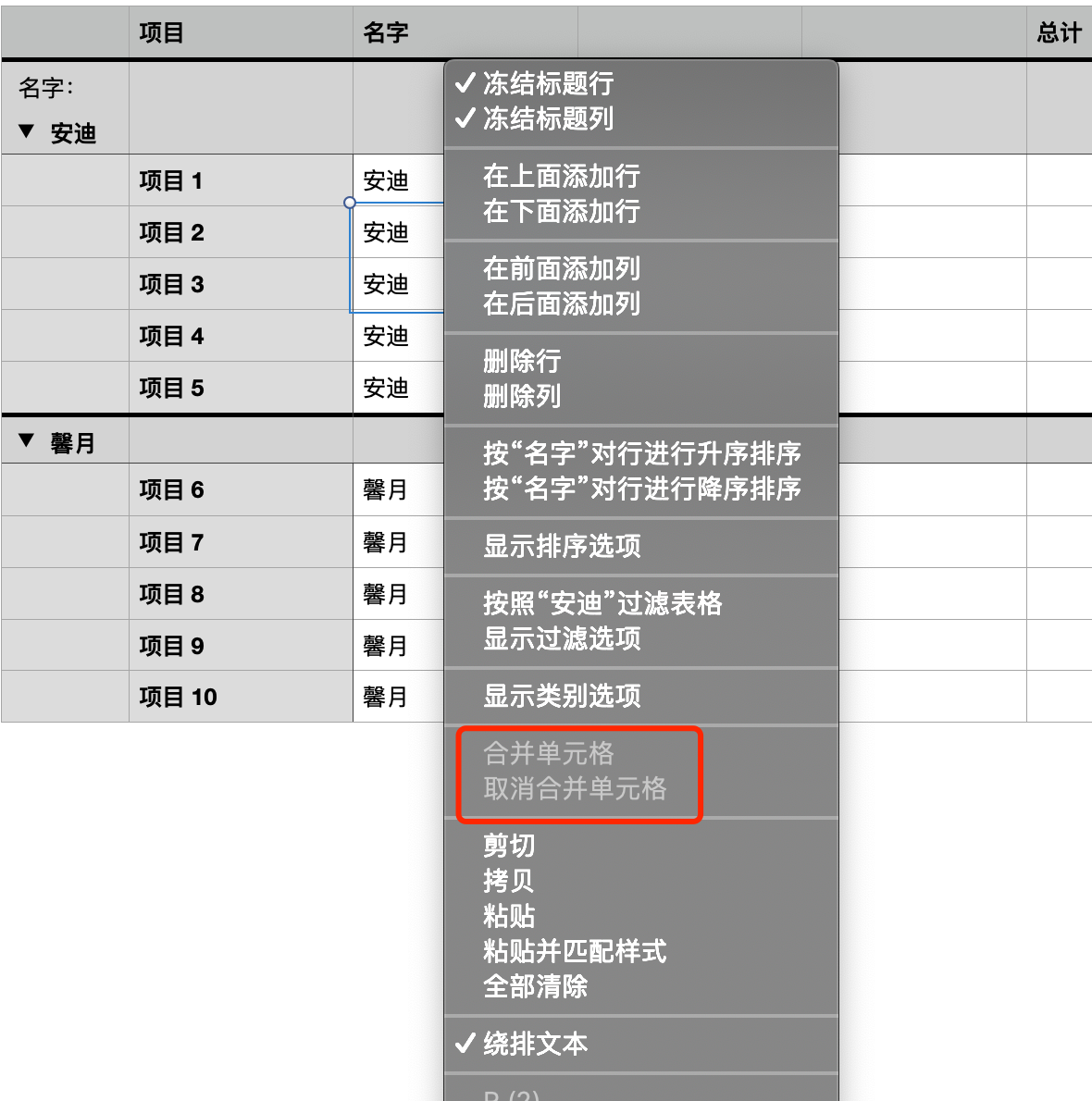 在 Mac 上的 Numbers 表格中合并或取消合并单元格