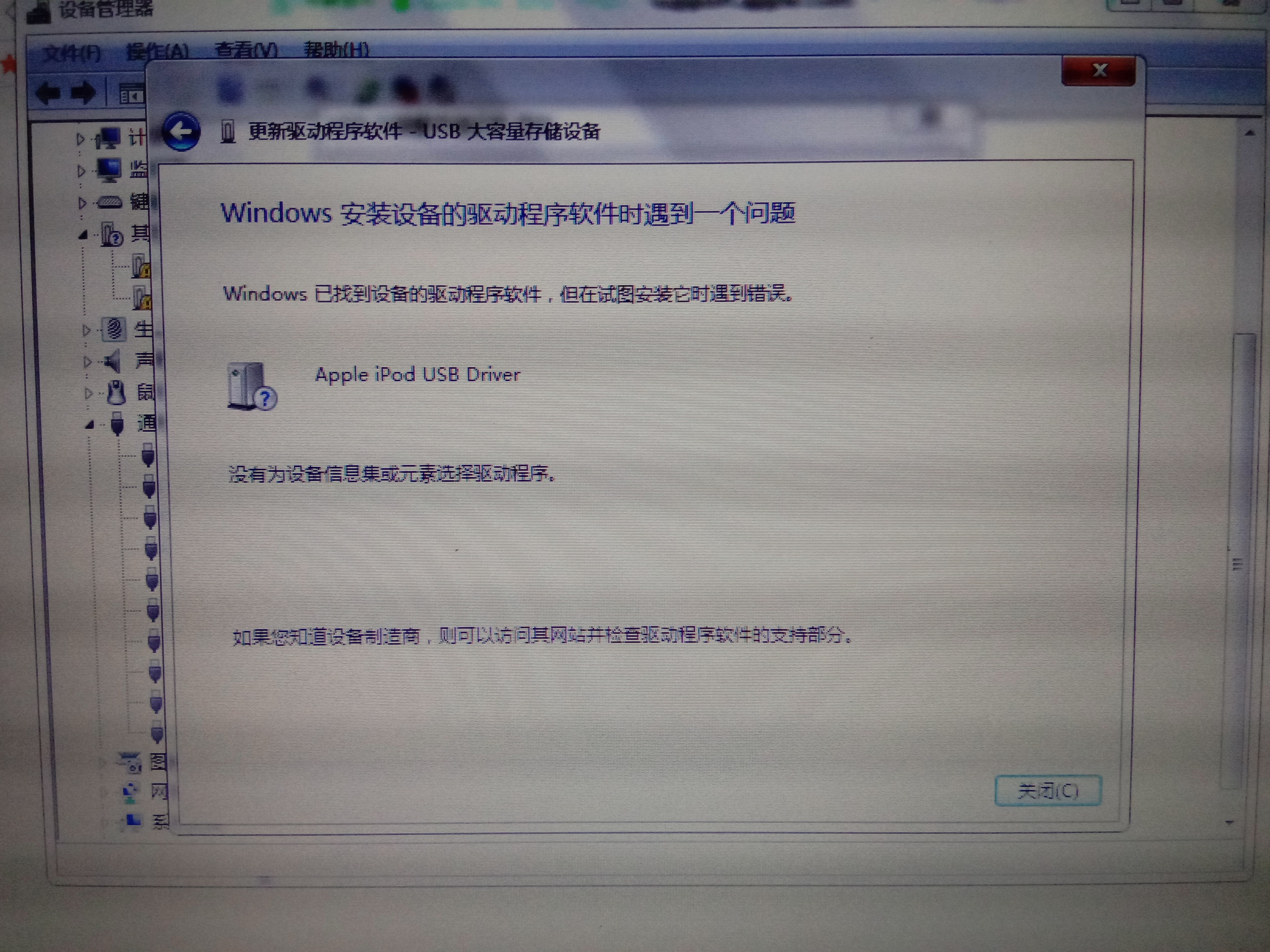 请问我的ipod nano6连接至pc(win7系统)却无法识别(连接上1秒就马上显示连接失败)是为什么?个人已排除机器和数据线的问题(均为原装),应该是驱动问题(如图),可本人并未在apple网站上查询到有关资料,还请向各位高手请教解决方案。谢谢啦!