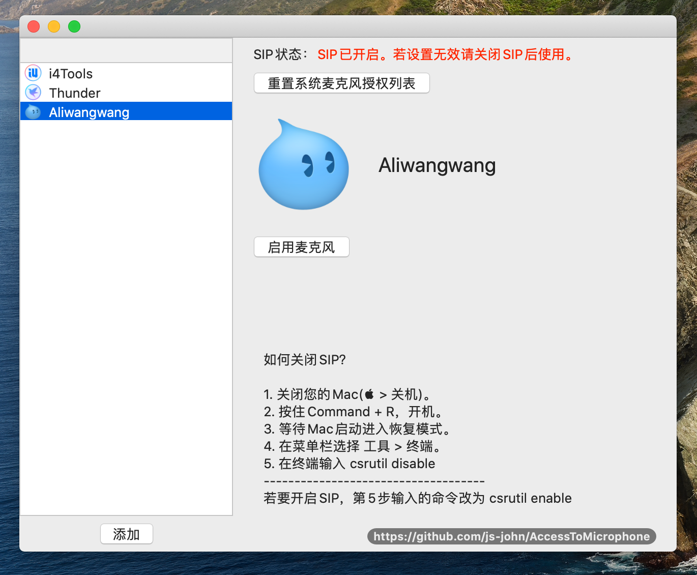 下载地址: https://github.com/js-john/AccessToMicrophone/releases/download/1.0/Access.dmg