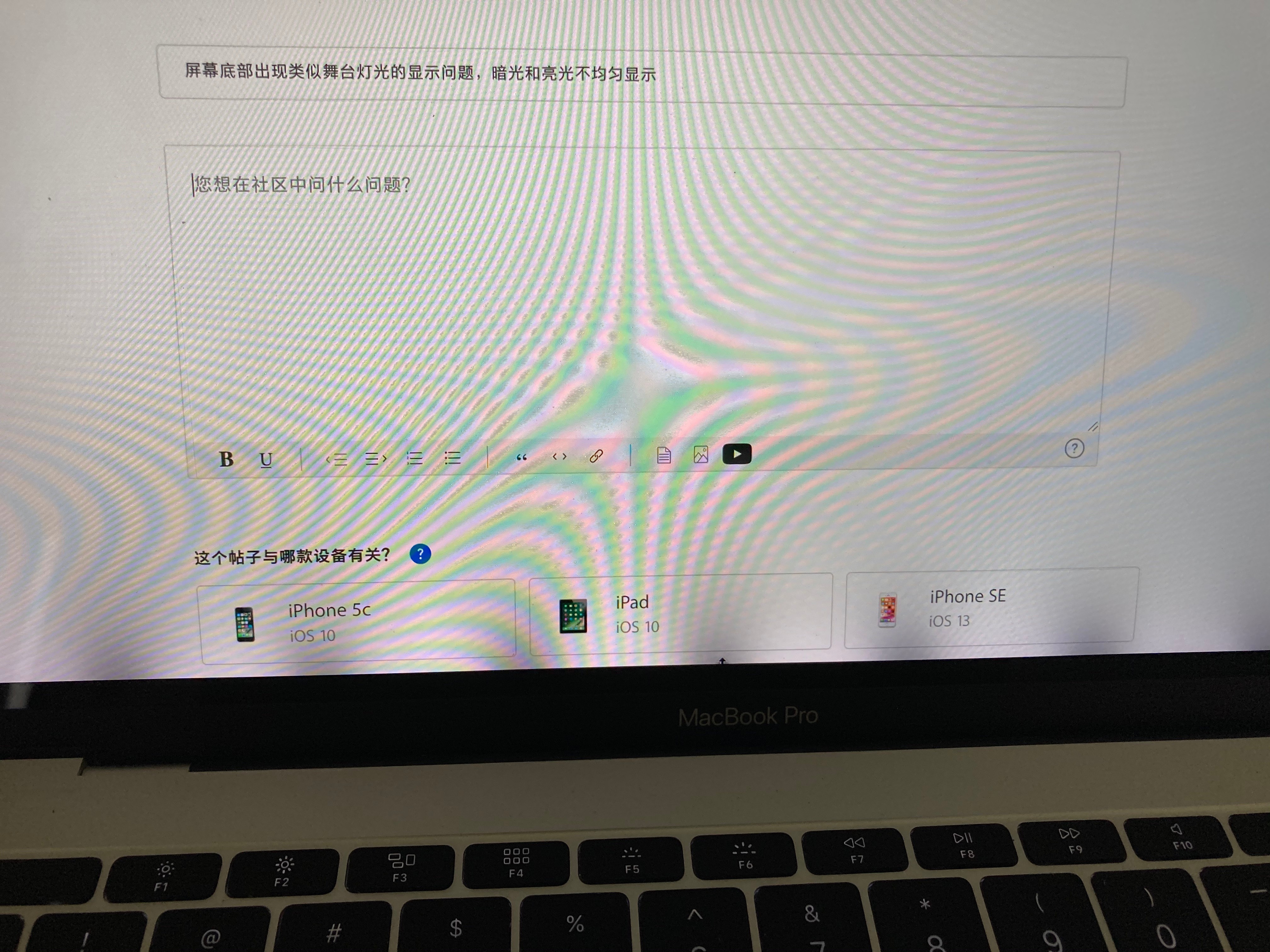 MacBook Pro (13-inch, 2017, Two Thunderbolt 3 ports)出现如下屏幕背光问题,暗光和亮光不均匀显示。请问这个可以怎么解决呢?