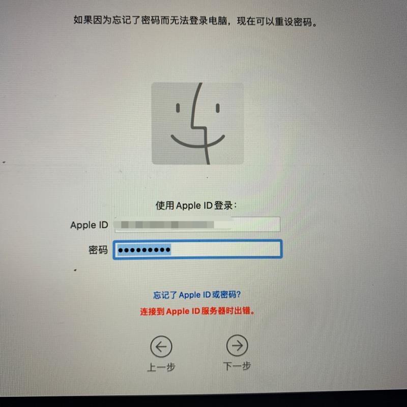 忘记开机密码,按照提示用AppleID更改密码,但是始终提示 与AppleID服务器连接出错