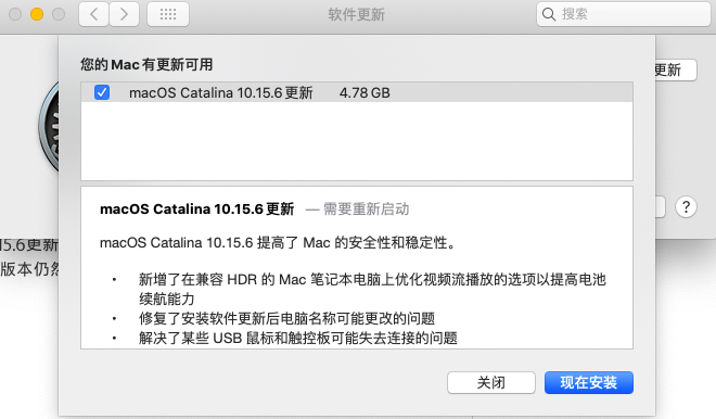 目前的系统版本Catalina10.15.3 (19D76),提示有10.15.6更新可用,点击更新后提示必须重新启动Mac。点击重新启动后,重启电脑,进入系统但并未进行更新,系统版本仍然是10.15.3。