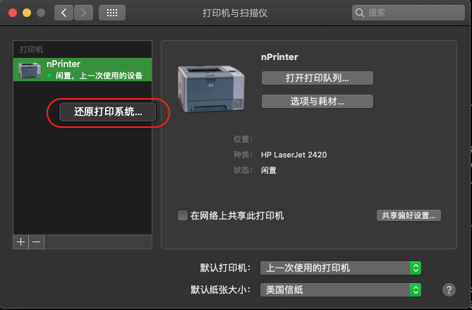 系统偏好设置 > 打印机与扫描仪,右键点击左侧打印机列表处,选择“还原打印系统...”,如下图:
